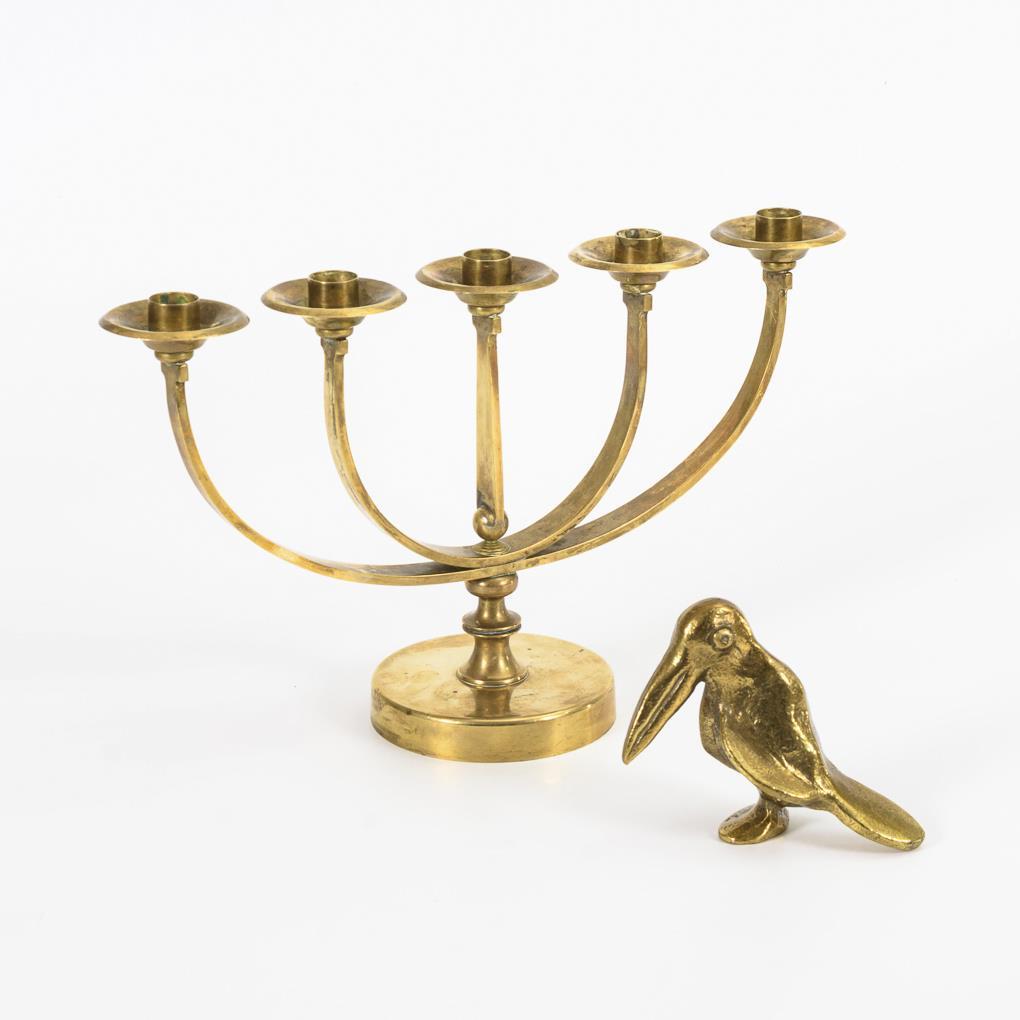 5-flammiger Kerzenleuchter und Vogelskulptur Art déco.