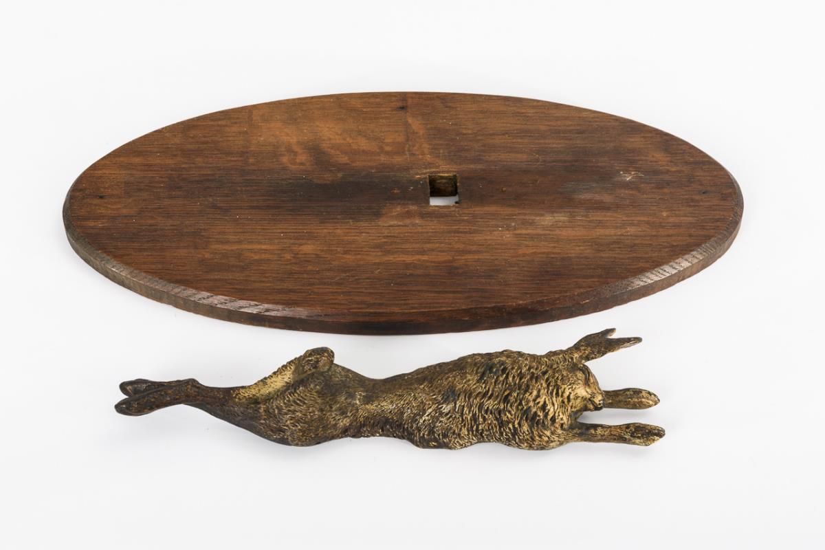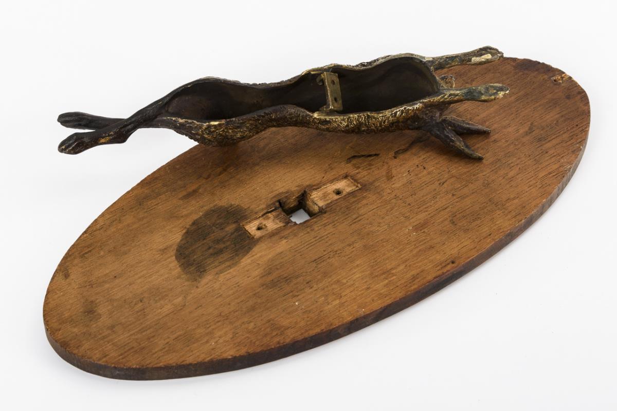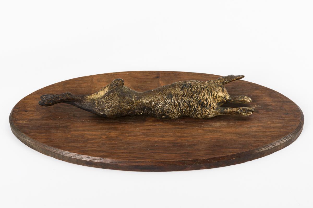 Bronze grau/braun bemalt, Eichenbrett gebeizt. L 26 cm, Brett 36 x 17 cm.