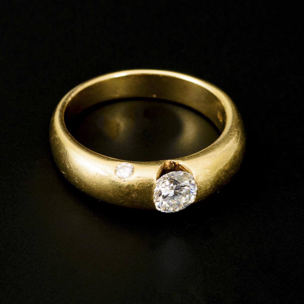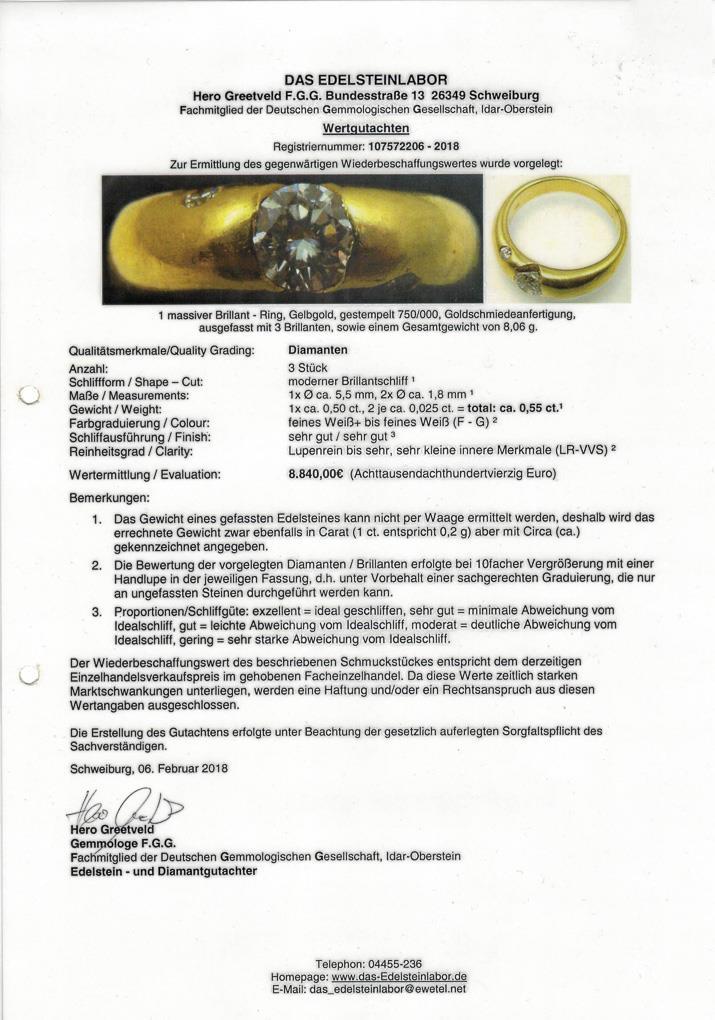 Gelbgold 750 gestempelt, Goldschmiedeanfertigung. Brillant ca. 0,50 ct, 2 kleinere Brillanten zus. ca. 0,05 ct/F-G/Lr-vvs, Ringgröße 55. 8,0 g.