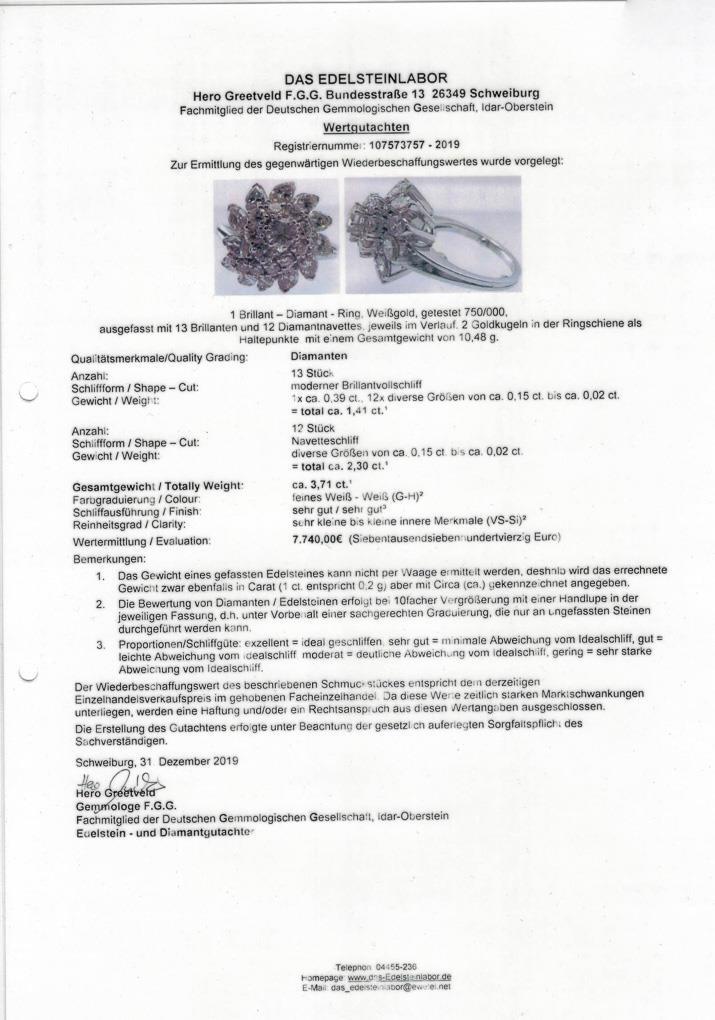 Weißgold 750 geprüft. Brillanten zus. ca. 1,41 ct, Diamanten zus. ca. 2,30 ct/G-H/vs-si. Ringgröße 47. 10,48 g.