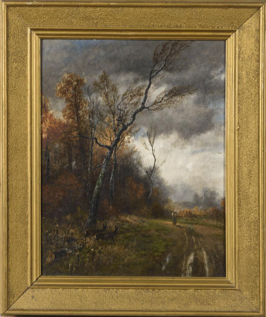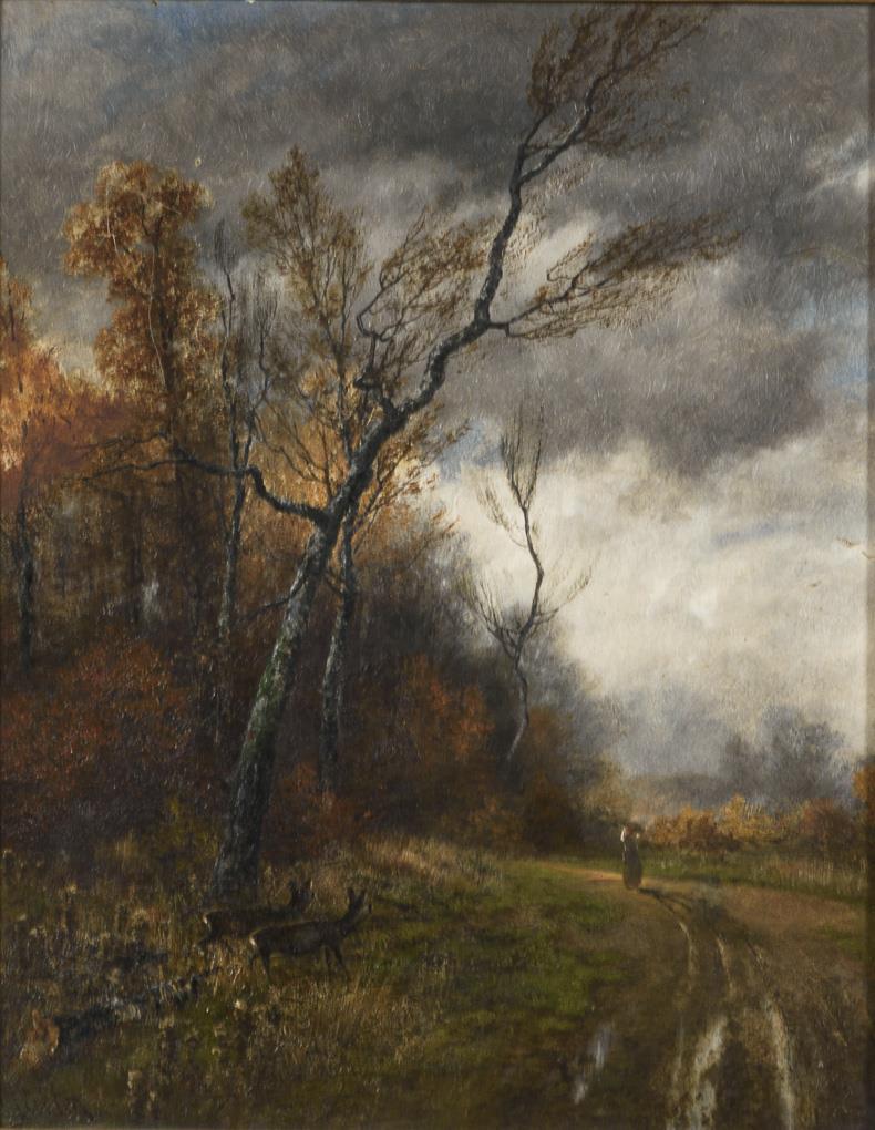 Waldrand mit Magd und vorsichtig auf die Straße gehenden Tieren.