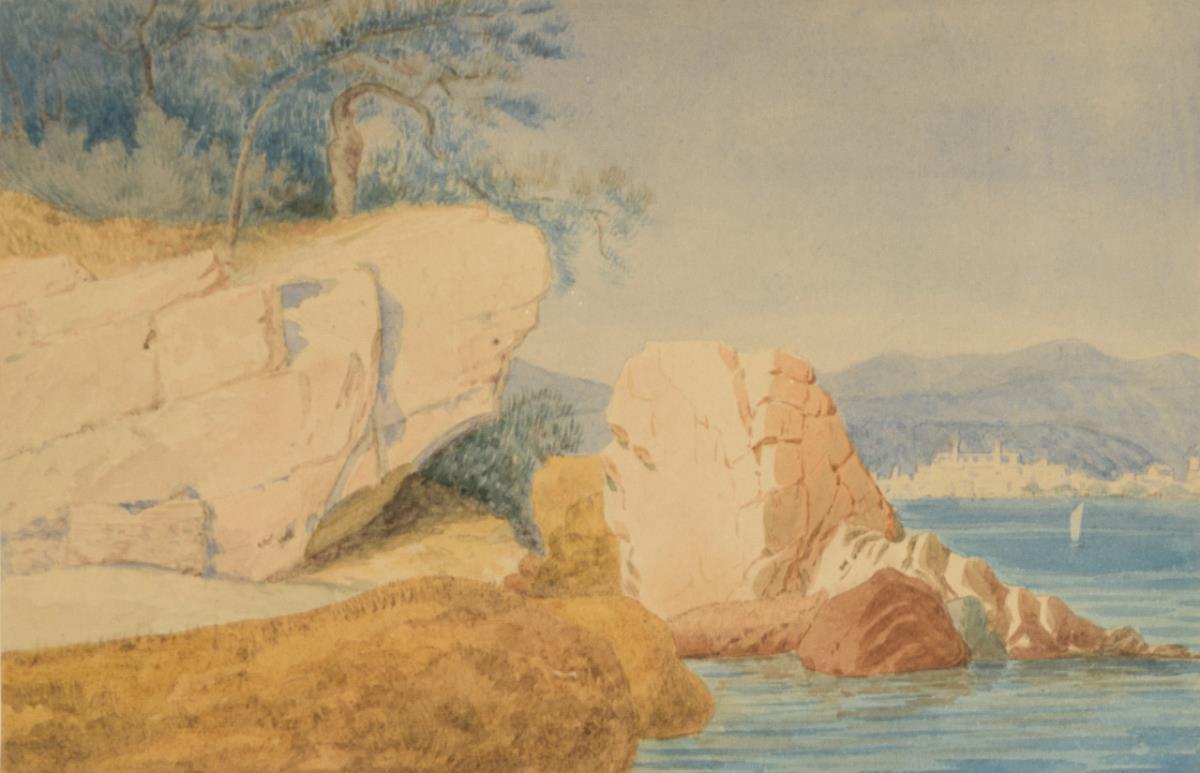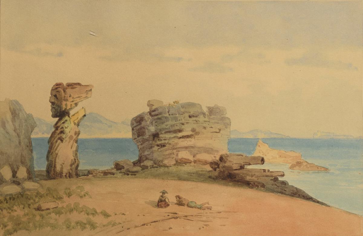Staffagefiguren vor Turmruine mit Blick übers Meer bei Menton.
