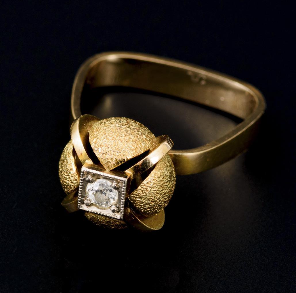 Kleiner Brillant in knospenförmig stilisiertem Ringkopf. Mittlere Schiene.