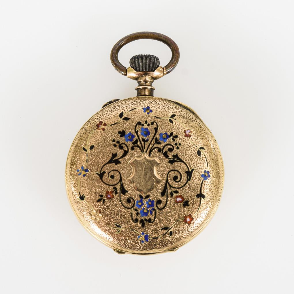 Goldene Damentaschenuhr mit farbigen Emailblüten.
