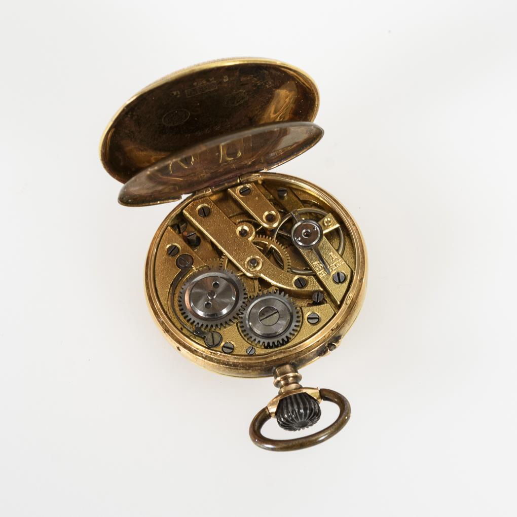 Ungemarktes Werk mit Zylinderhemmung und Kronenaufzug. Läuft. Weißes Emailzifferblatt mit kleinem römischen Ziffernring, Minuterie und teils ergänzten Zeigern.