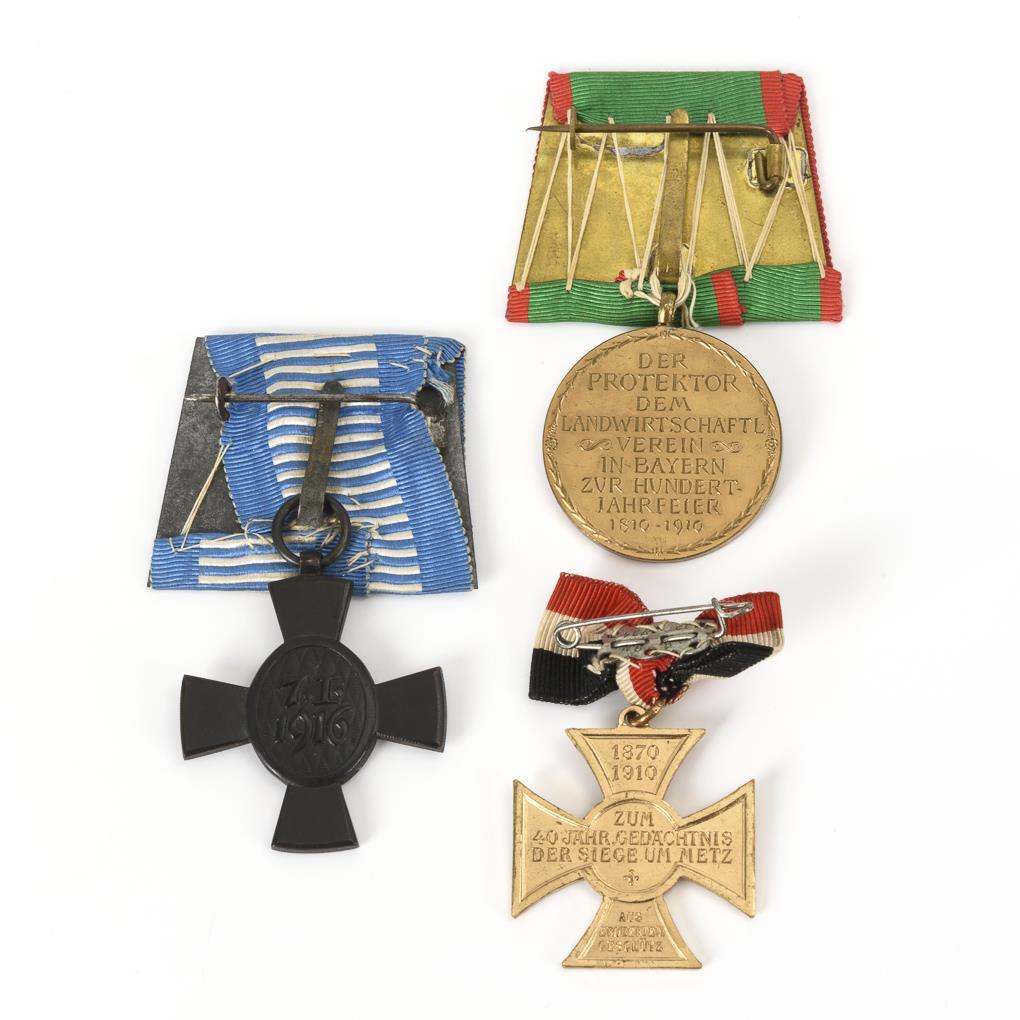 Erinnerungskreuz "zum 40jährigen Gedächtnis der Siege um Metz 1870-1910", Geschützbronze, an schwarz-weiß-roter Bandschleife mit Nadel. / König-Ludwig-Kreuz, Bayern 1916, Bronze geschwärzt, am trapezförmigen blau-weißen Band. / Landwirtschaftliche Jubiläumsmedaille, Bronze, Porträt Prinzregent Luitpold und Zweckinschrift „Der Protektor...1810-1910“, Bayern, am grün-roten Band in Trapezform.