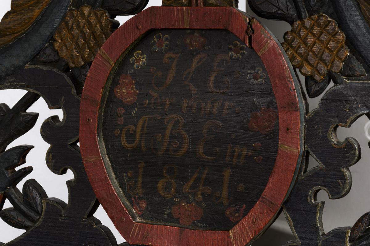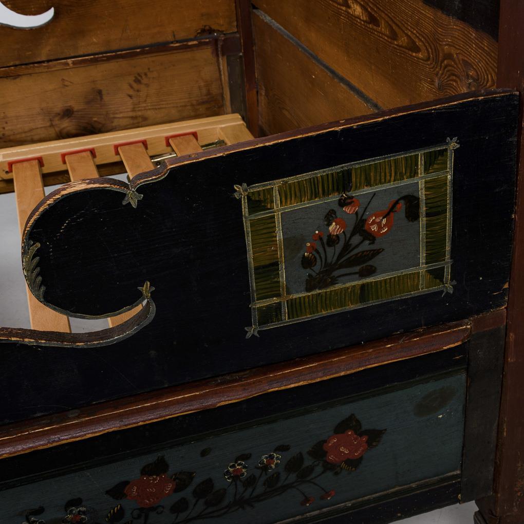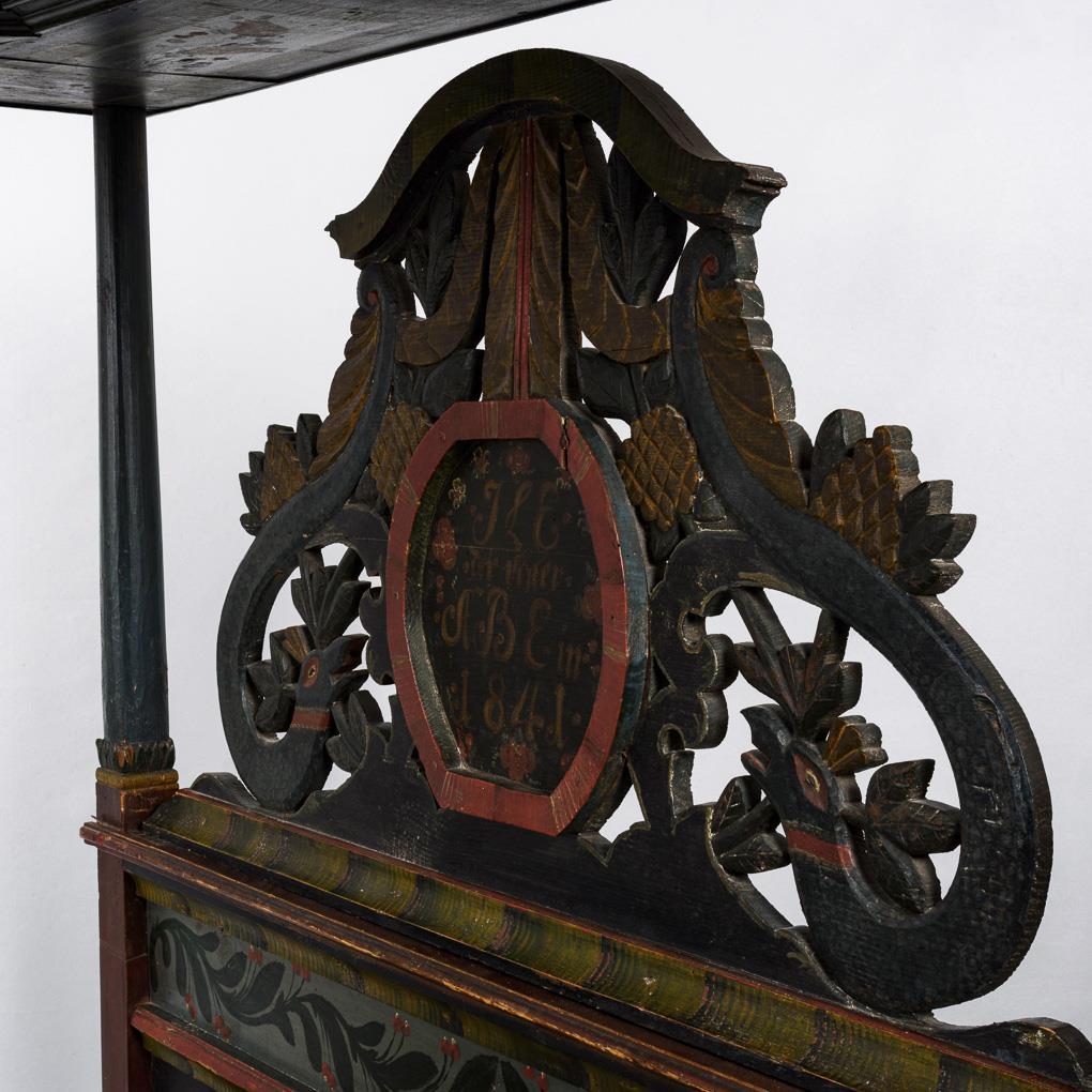 Bauern-Pfostenbett mit Himmel und aufsteckbarem Kopfteil, bemalt mit Blumen und Rankendekor, Kartusche im Kopfteil bezeichnet "ILE der Vater ABE in 1841". Alters-/Gebrauchsspuren, kleinere Fehlstellen, inaktiver Anobienbefall, Fassung mit Bereibungen, neuer Lattenrost als Zugabe.