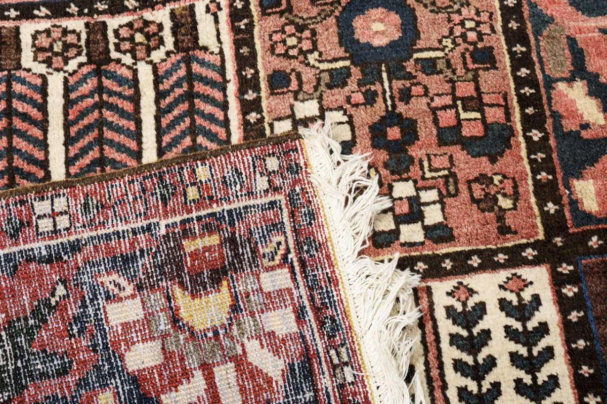 In rechteckige Felder gegliederter Bilderteppich mit Lebensbäumen, gestuften Nischen und Trauerweiden. Dreireihige Bordüre mit Palmetten. Alters- und Gebrauchsspuren, ausgewaschenes Kolorit, defekte Fransenabschlüsse.