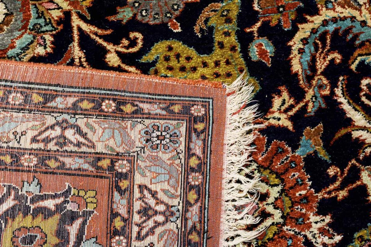Sternmedaillon auf nachtblauem, floral durchgemustertem Mittelfeld mit Tiermotiven. Mehrreihige Bordüre mit Palmettenranken. Partiell Defekte an Flor, Rändern und Abschlüssen.