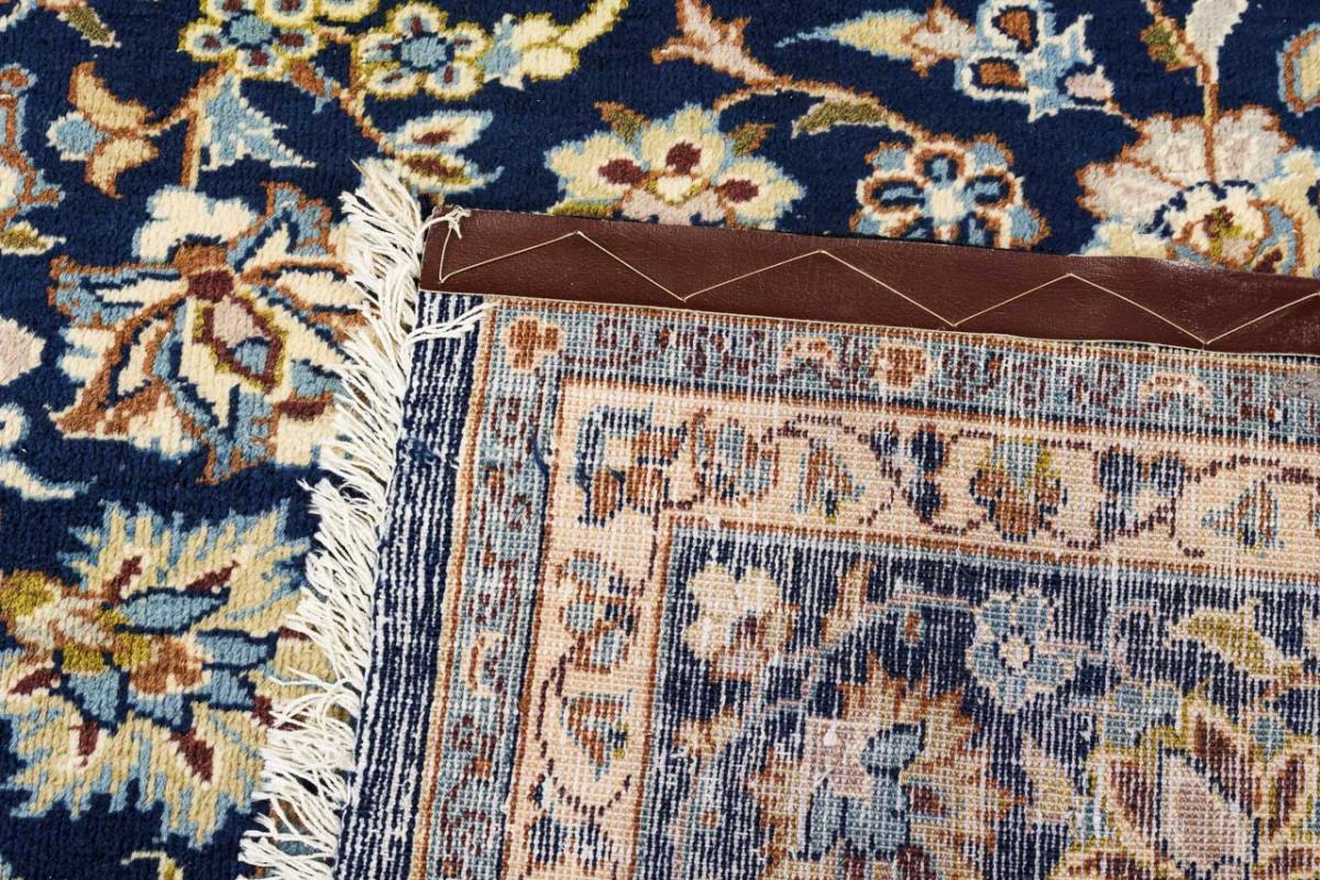 Wolle, handgeknüpft. Polychromdekor mit vorwiegend Blautönen und Elfenbein. 338 x 234 cm.