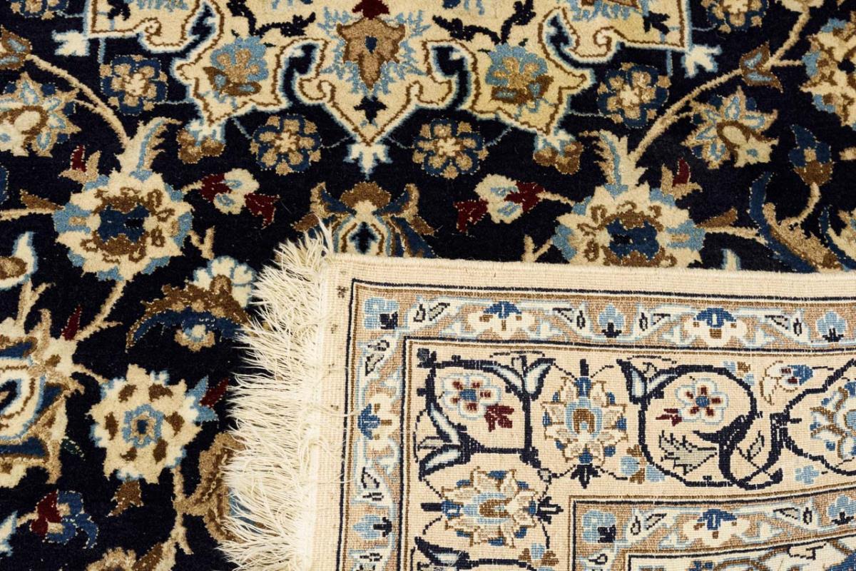 Helles, 16-teiliges Rosettenmedaillon auf nachtblauem Spiegel, umspielt von Floralranken. Dreireihige Bordüre mit Ranken und Palmetten. Leichte Alters- und Gebrauchsspuren.