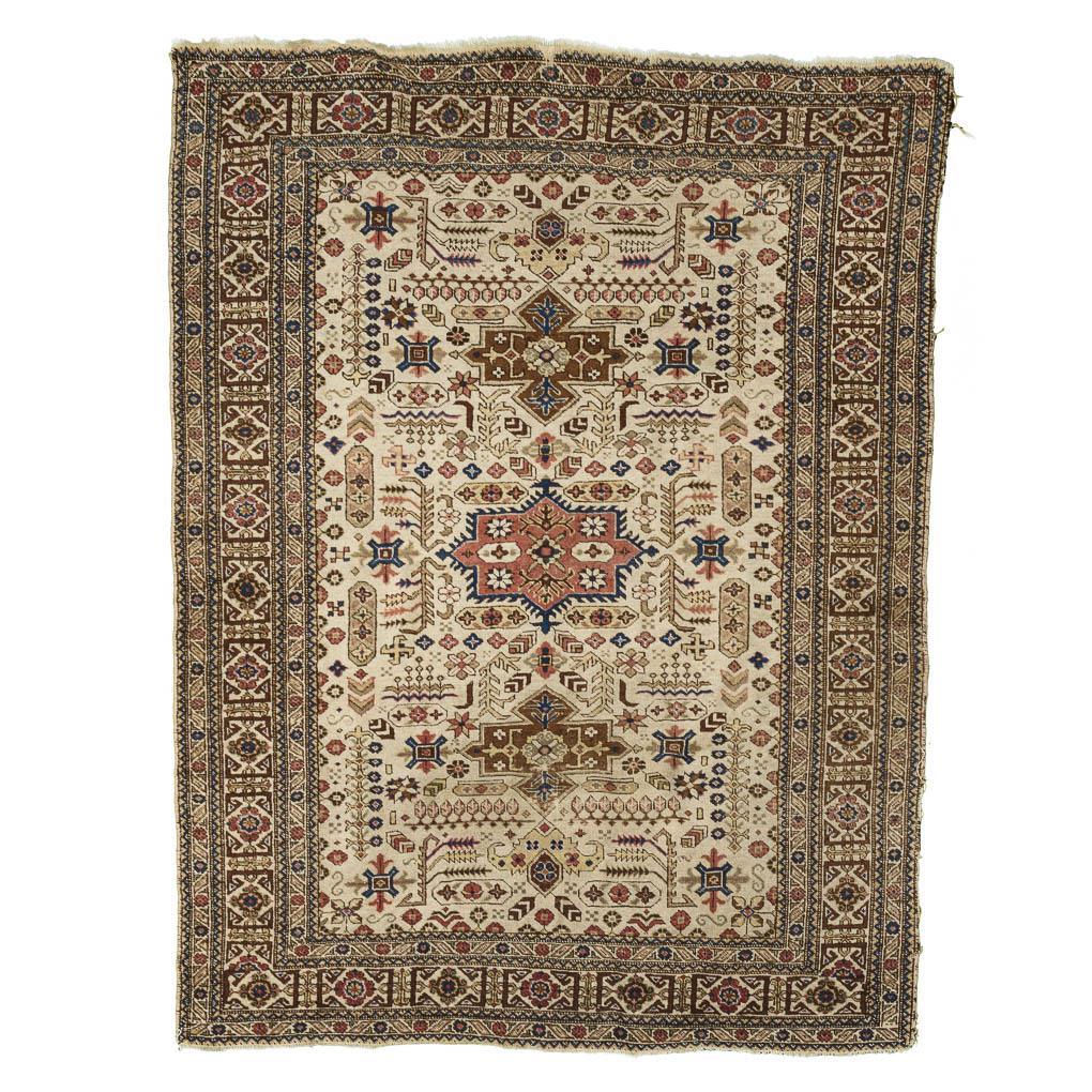Wolle, handgeknüpft. Polychromdekor mit elfenbeinfarbenem Fond. 180 x 133 cm.