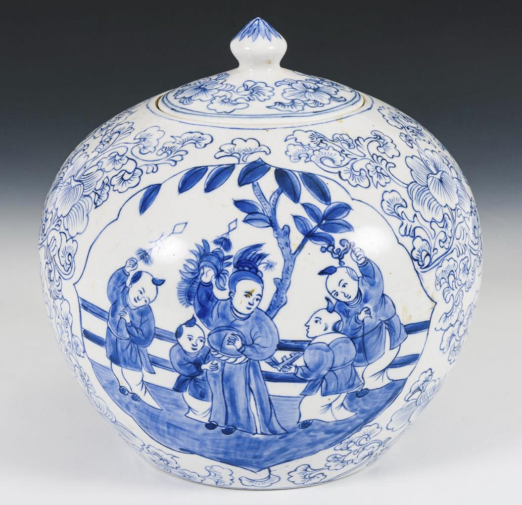 Zwei Bildkartuschen mit spielenden Kindern, eingefasst von stilisierten Päonienblüten als Muster. Flacher Deckel mit Zwiebelknauf. Kratzspuren am Boden.