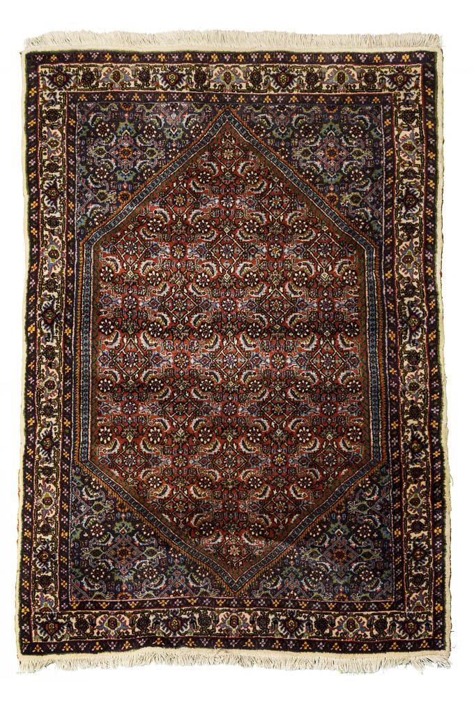 Allover durchgemusterter Herati mit hexagonalem Spiegel. Dreireihige Bordüre mit stilisierter Samowar-Bordüre.