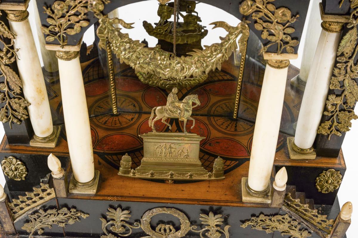 Portaluhr mit 4 Alabastersäulen und verspiegelter Rückwand, seitlichen Treppenaufgängen und reicher floraler Messingverzierung mit Ranken und Reiterstandbild. Bekrönung und seitliche Füllhörner mit Adlern. Defekte, Reparaturen, Ergänzungen, Alters- und Gebrauchsspuren. Restaurierungsbedürftig.