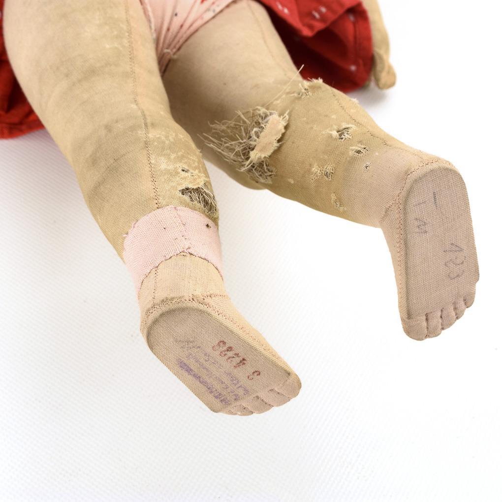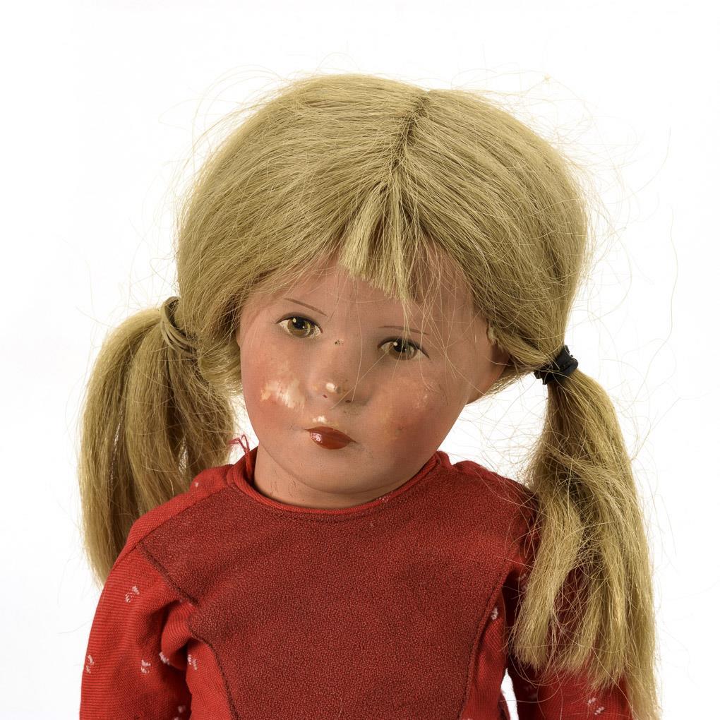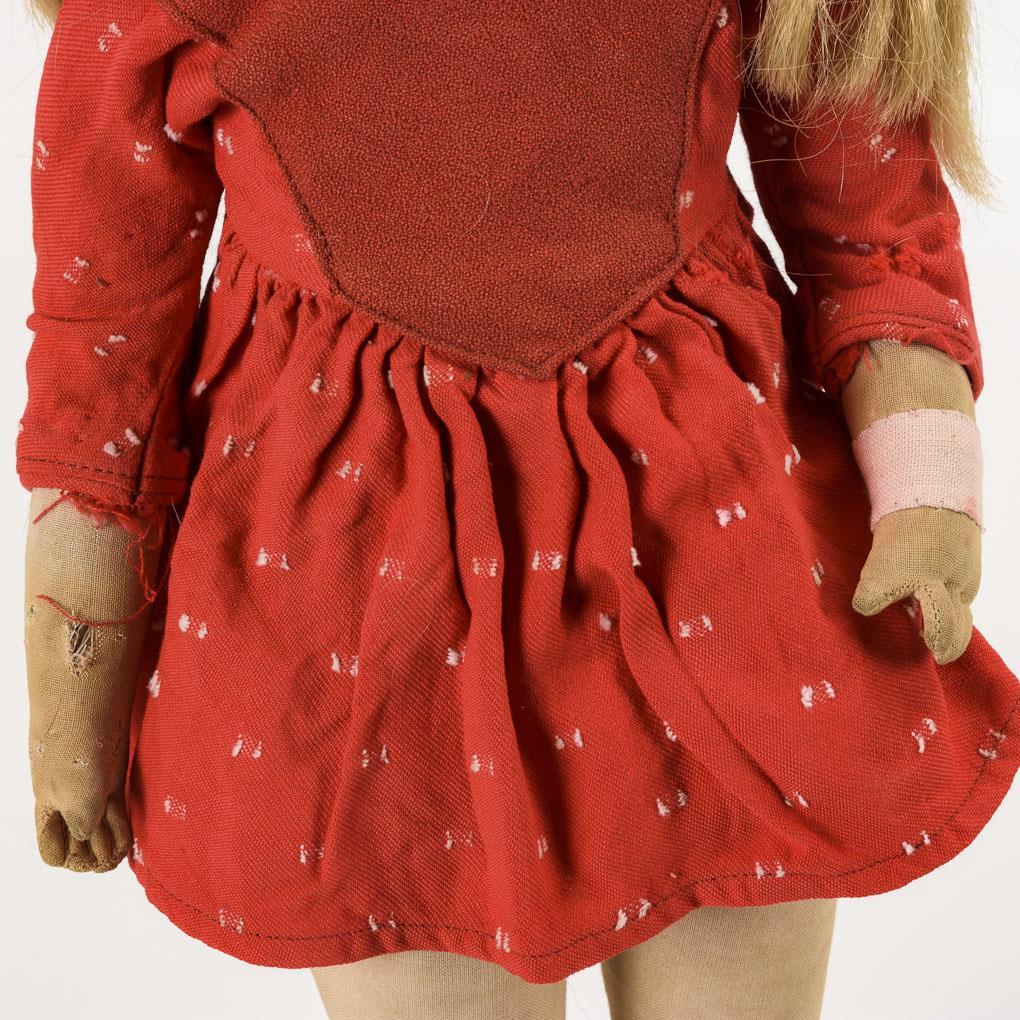 Wohl Puppentyp VIII mit drehbarem Kopf, gemalten braunen Augen, blonder Echthaarperücke und Stoffkörper. Rotes Kleidchen, schwarze Schuhe. Wangen berieben, Körper mit Defekten und provisorischen Reparaturen.