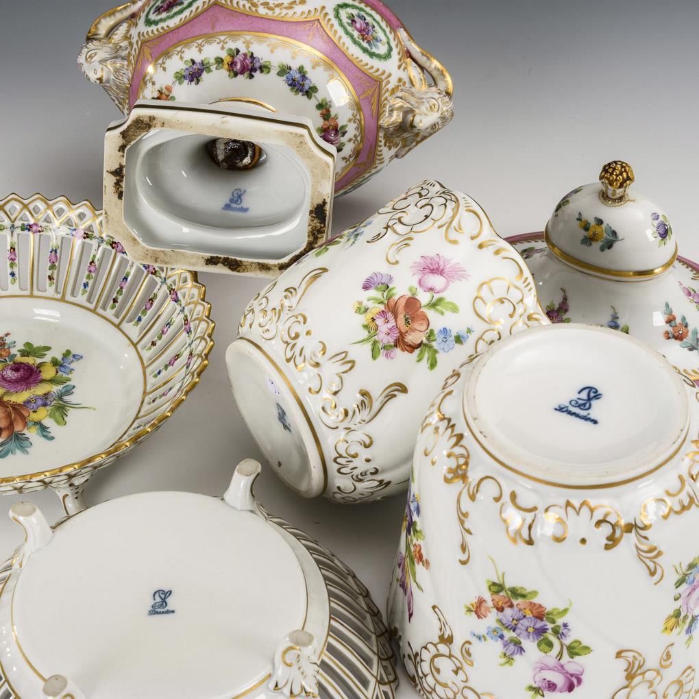 2 Durchbruchschalen, 2 Cachepots und 1 Deckelvase. Potschappel.