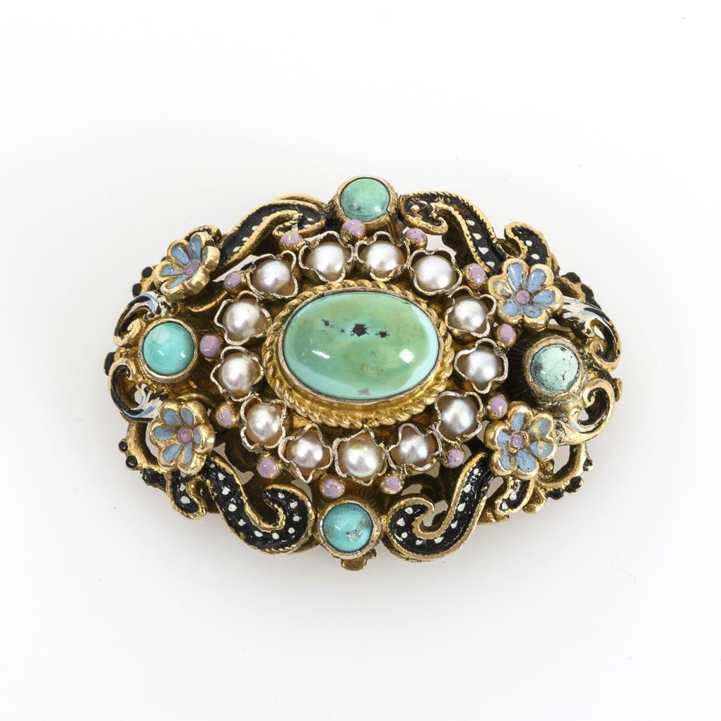 Schwere Brosche, besetzt mit 5 Türkiscabochons und 13 Zuchtperlchen. Blüten- und Rankenzier emailliert. Schiebehaken.