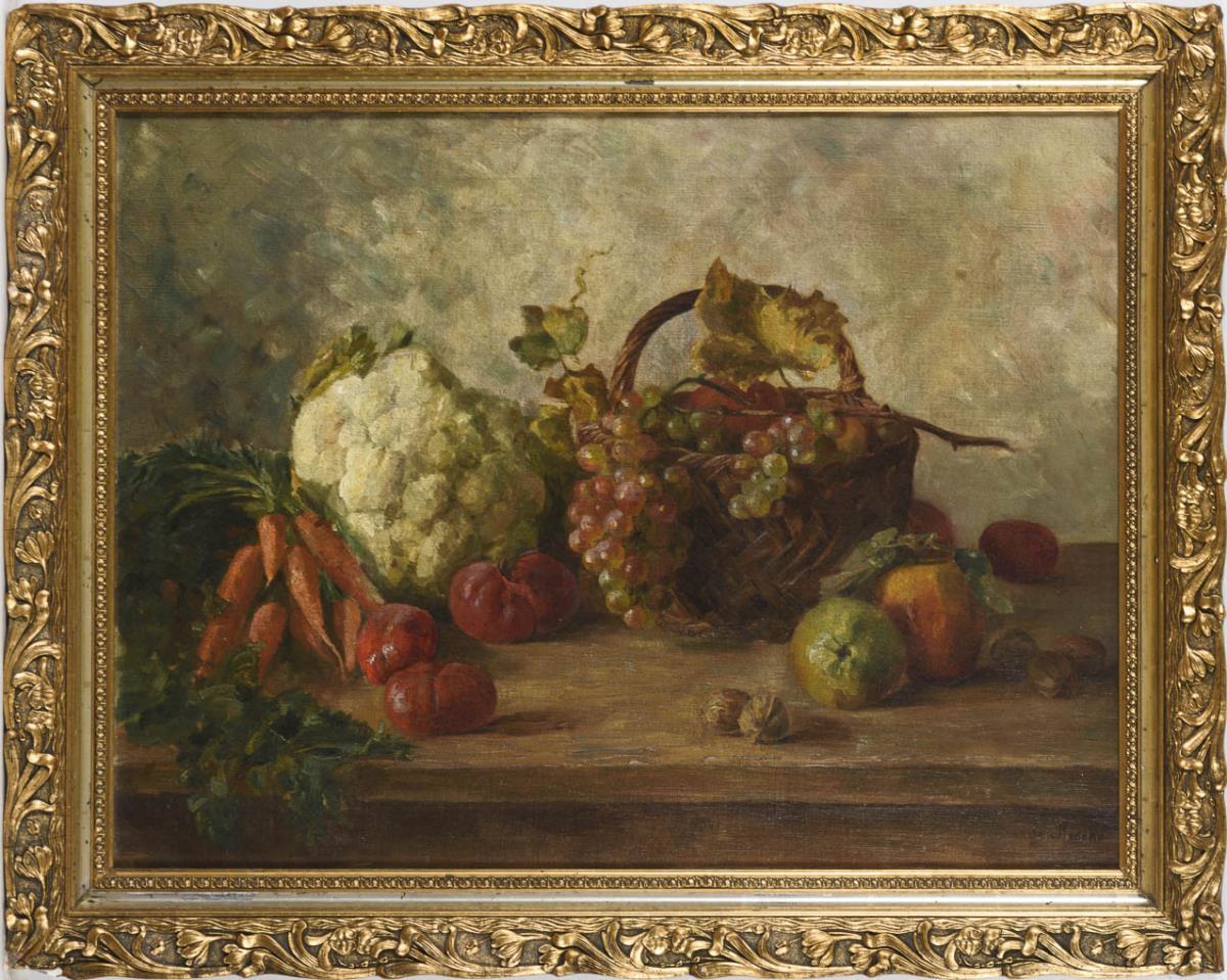 Undeutlich signiert: Stillleben mit Blumenkohl und Trauben