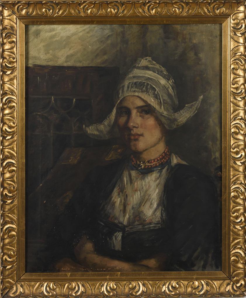 Bildnis einer jungen Holländerin mit typischer weißer Kopfbedeckung. Altersspuren.