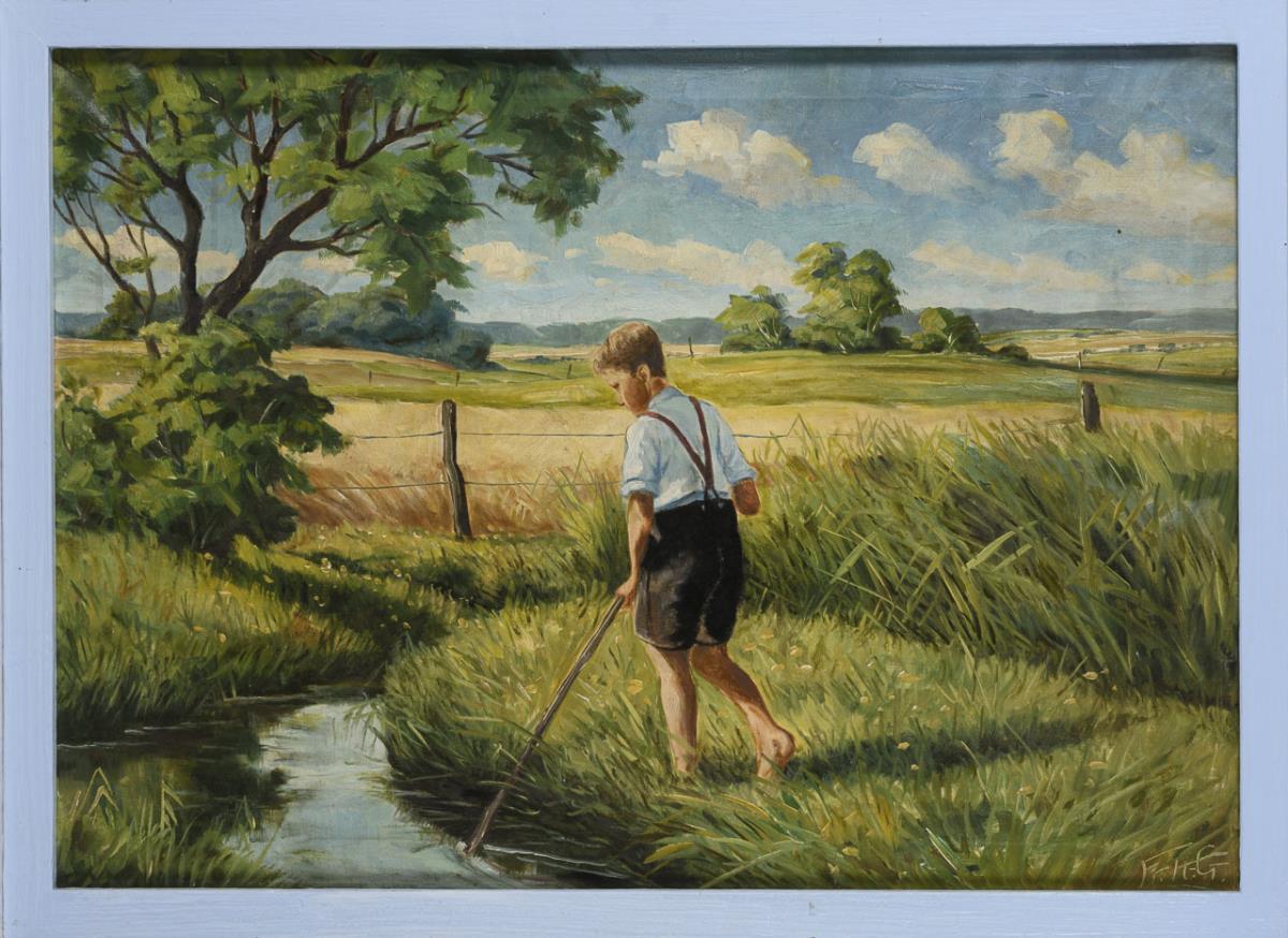 Der blonde Junge am Bach in der weiten Sommerlandschaft. Eine restaurierte Stelle mit Hinterklebung.