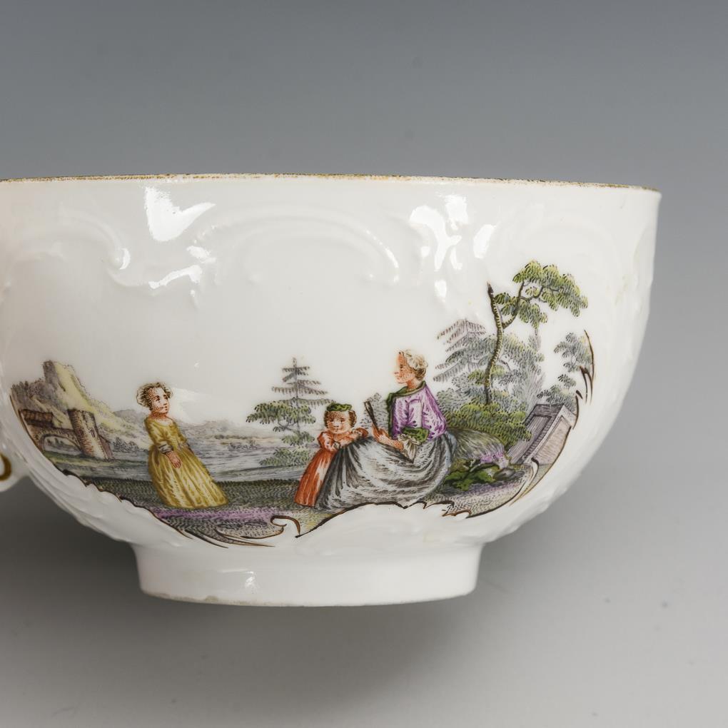 Tasse mit Rocaillerelief. In Rocaillekartuschen fein gemalte Watteauszenen bzw. Blumenbuketts. Minimale Bereibungen am Goldrand.