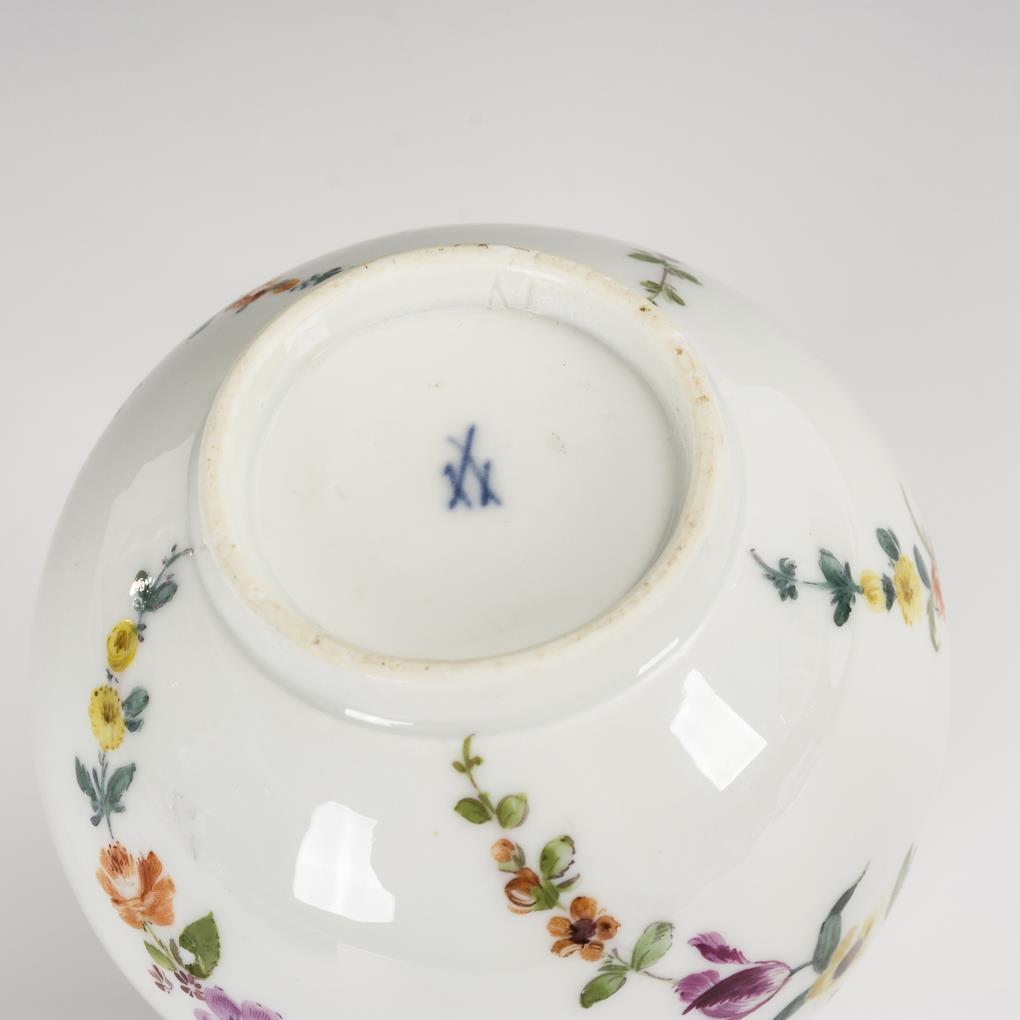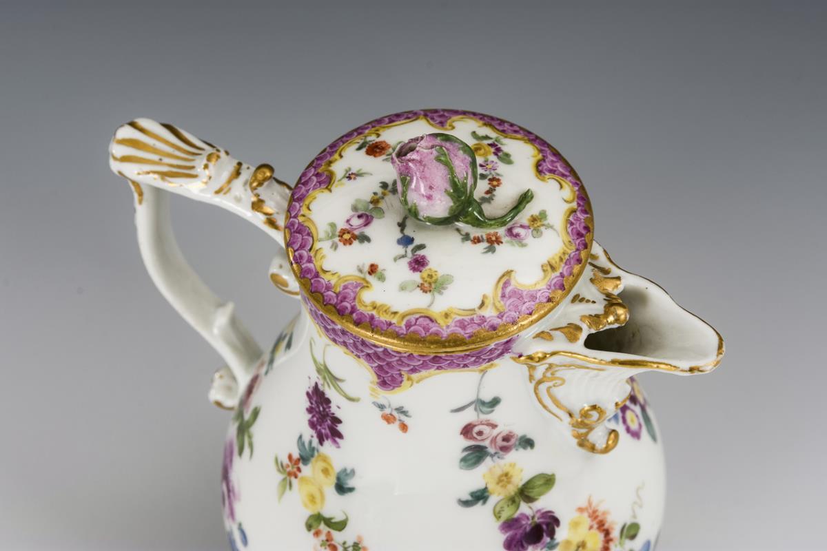Birnkännchen mit Rocaillehenkel und -schneppe. Unter einer purpurfarbenen Schuppenbordüre geschwungene Blütenfestons. Rosenknauf bestoßen, partiell minimaler Goldabrieb.
