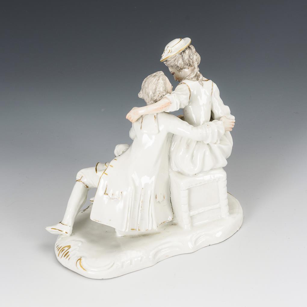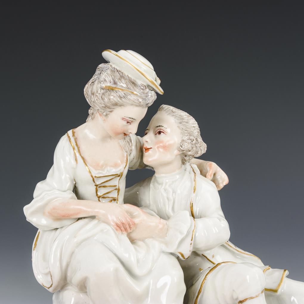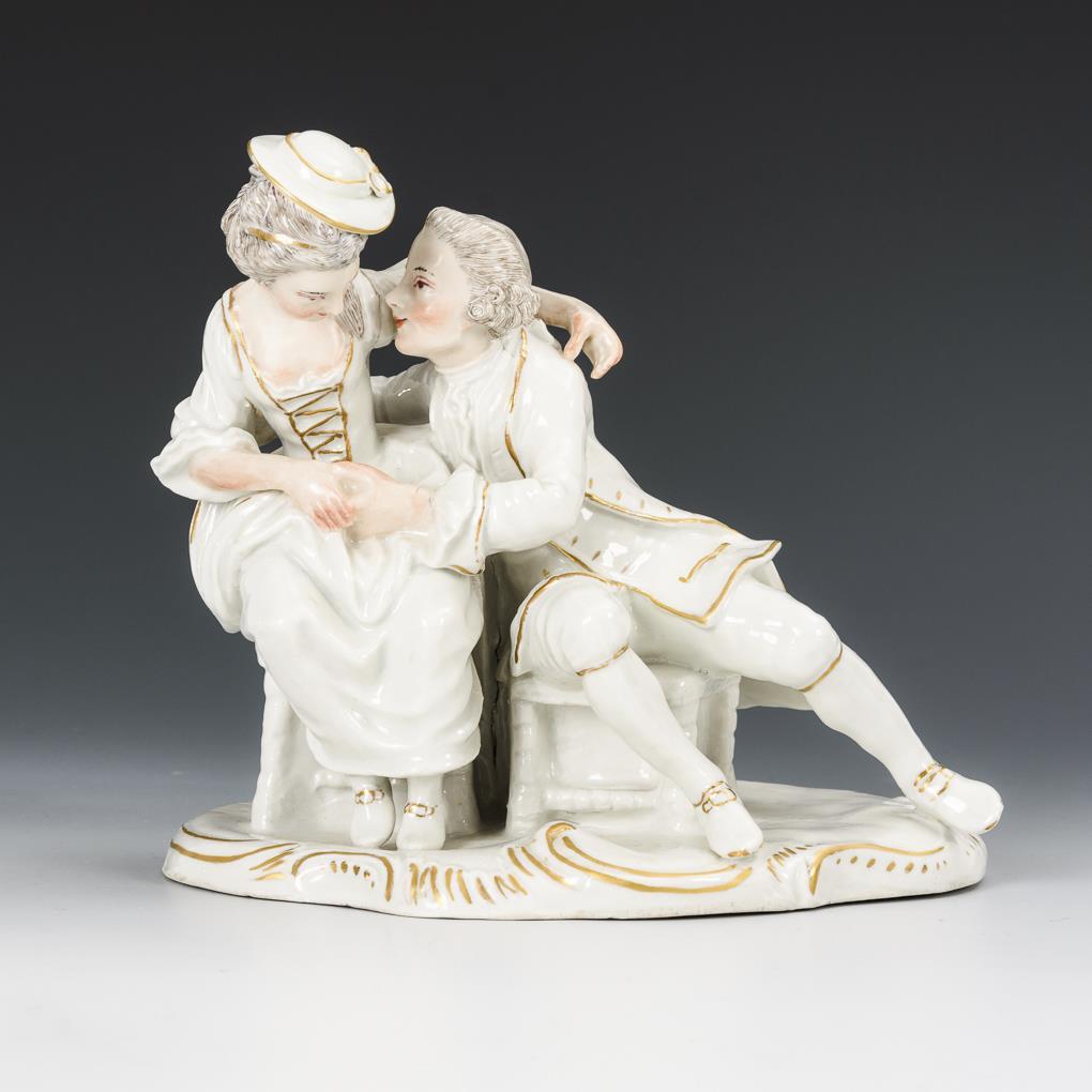 Rokokogruppe eines sitzenden Liebespaares. Hut der Dame restauriert.