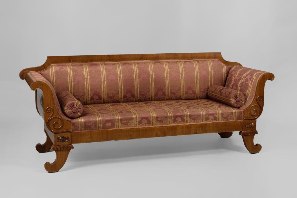 Stiltypisches Sofa mit gerader Lehne und volutierten Armlehnen und Füßen, verziert mit spiralförmigen Schnitzereien, Polster mit roséfarben gestreiftem Bezug mit üppigem Floralmuster. Alters-/Gebrauchsspuren, Polster und Bezug ergänzt, Furnier mit Defekten.