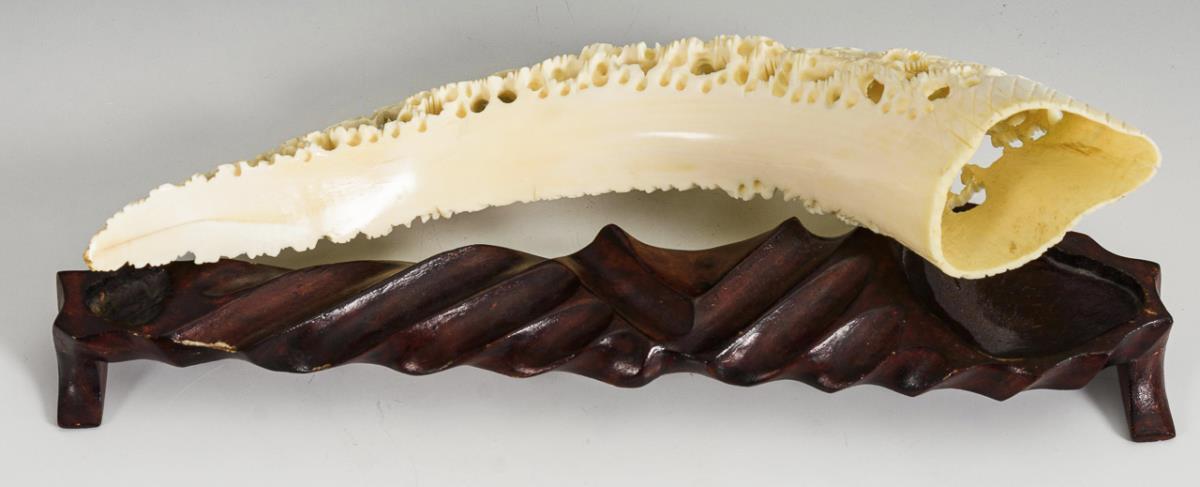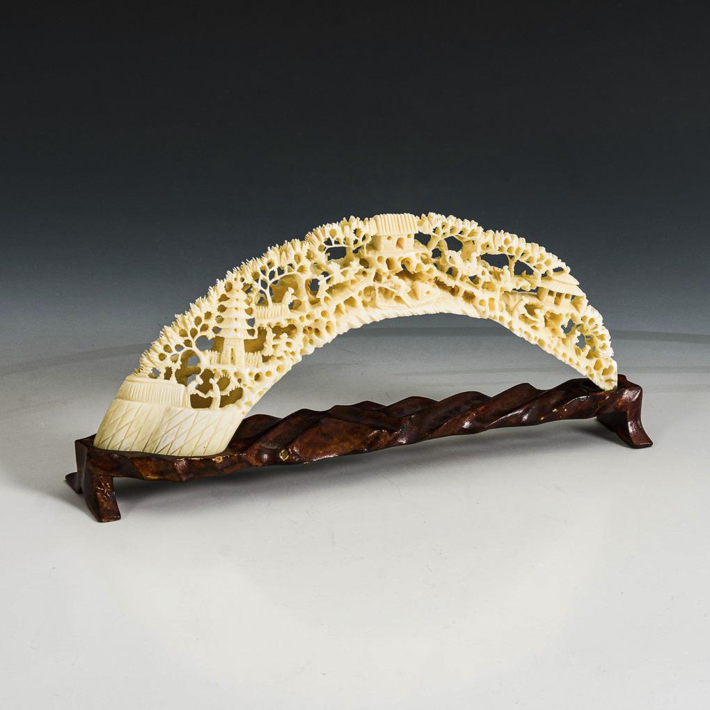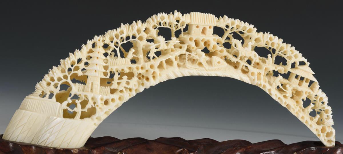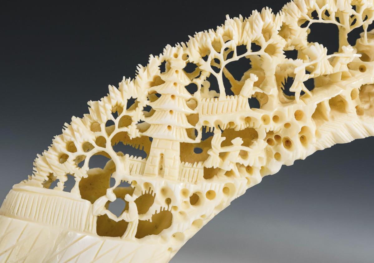 Durchbrochen geschnitzte Landschaft mit zahlreichen Figuren zwischen Bäumen und Häusern.
