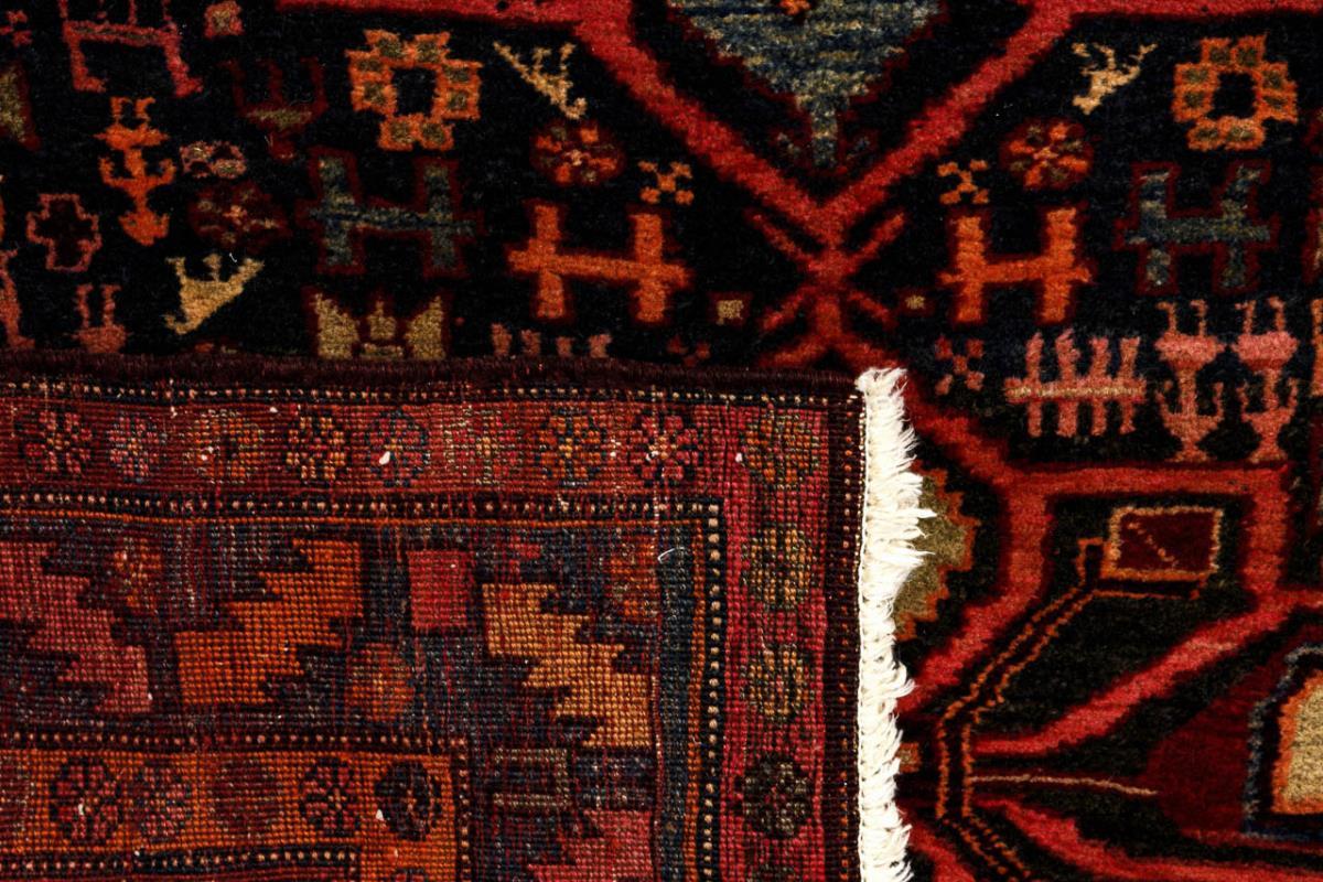 Wolle, handgeknüpft. Dunkler Fond aus Rot und Nachtblau, zurückhaltender Polychromdekor mit Abrasch. 301 x 132 cm.