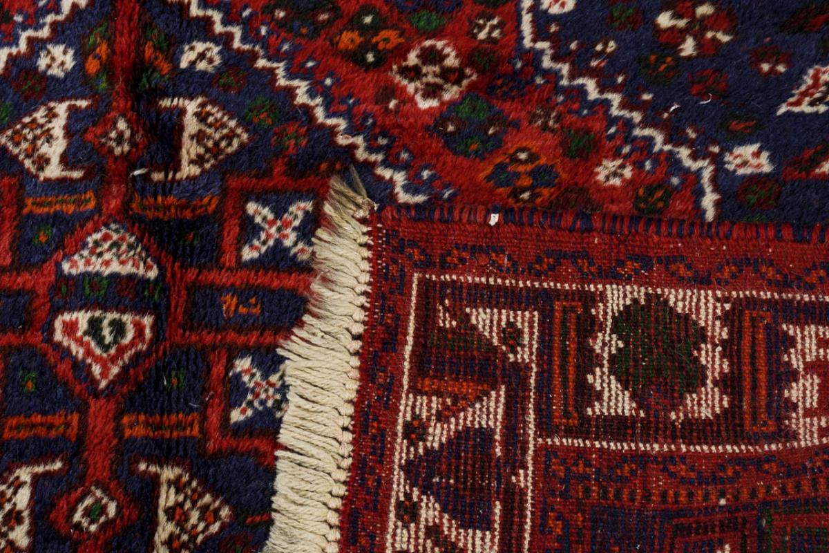 Wolle und Ziegenhaar, handgeknüpft. Polychromdekor mit vorwiegend Rot, Blau und Weiß. 240 x 155 cm.