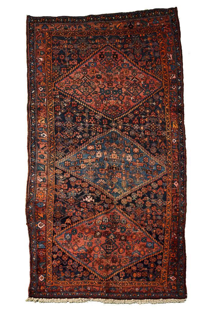 3 gezackt geränderte Rautenmedaillons auf gefülltem Mittelfeld mit Herati-Motiven und geometrisiertem Floraldekor. Dreireihige Bordüre mit Blumenornamenten. Defekte Abschlüsse, Reparaturen, teils verwaschene Farben.