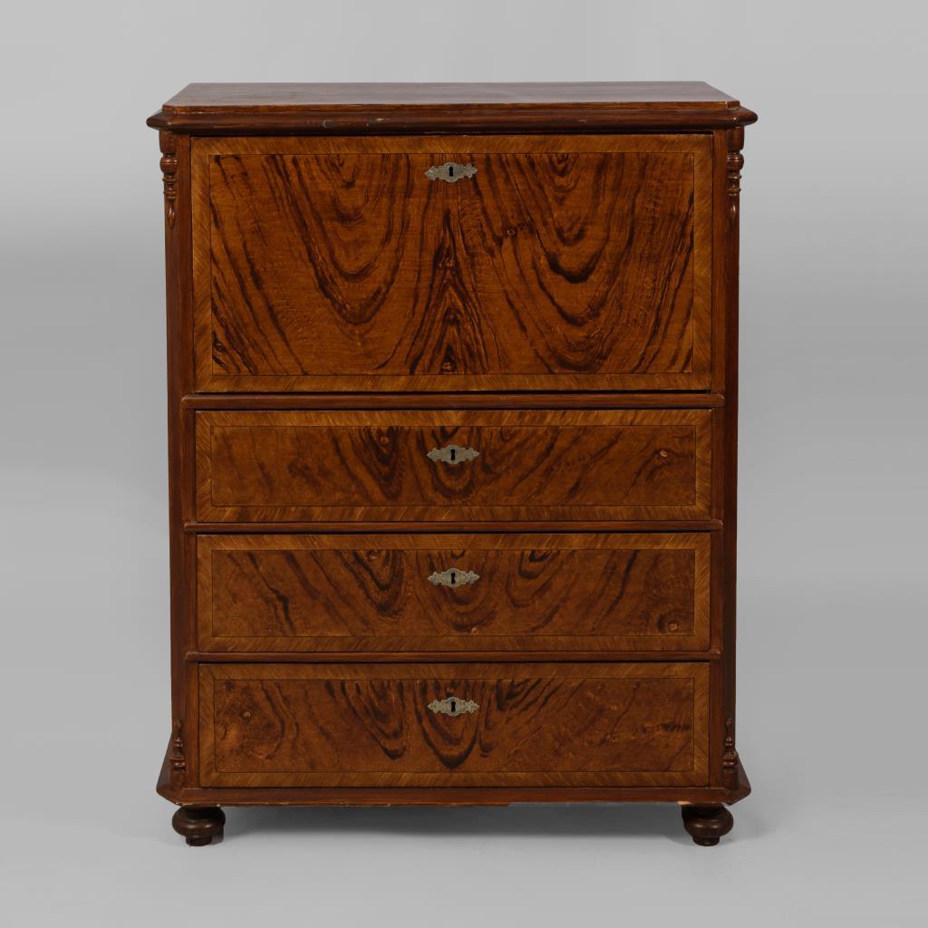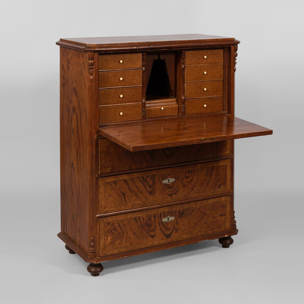Schlichter Schreibschrank mit Schreibklappe und 3 Schüben; innen mit 9 kleinen Schüben und 1 offenem Fach mit vorhangartigem Schnitzdekor. Gebrauchsspuren, Trockenrisse.