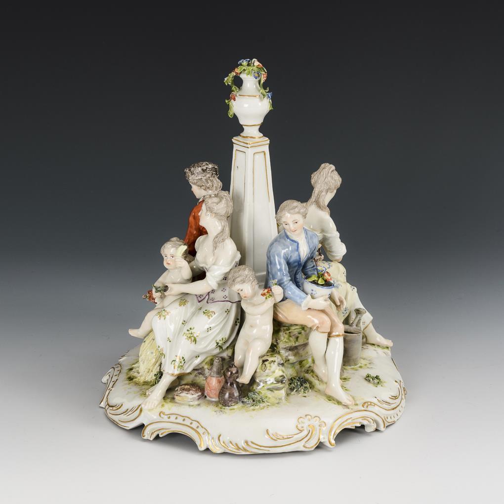 Vier um einen Obelisken sitzende Personifikationen der Jahreszeiten, bekleidet von einem Putto. Restauriert.