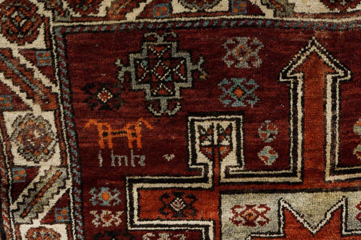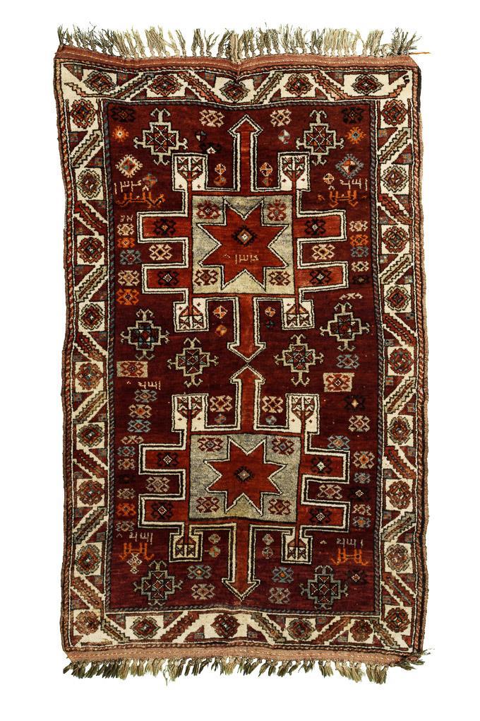 Wolle und Ziegenhaar, handgeknüpft. Polychromdekor mit vorwiegend Rot und Elfenbein. 200 x 115 cm.