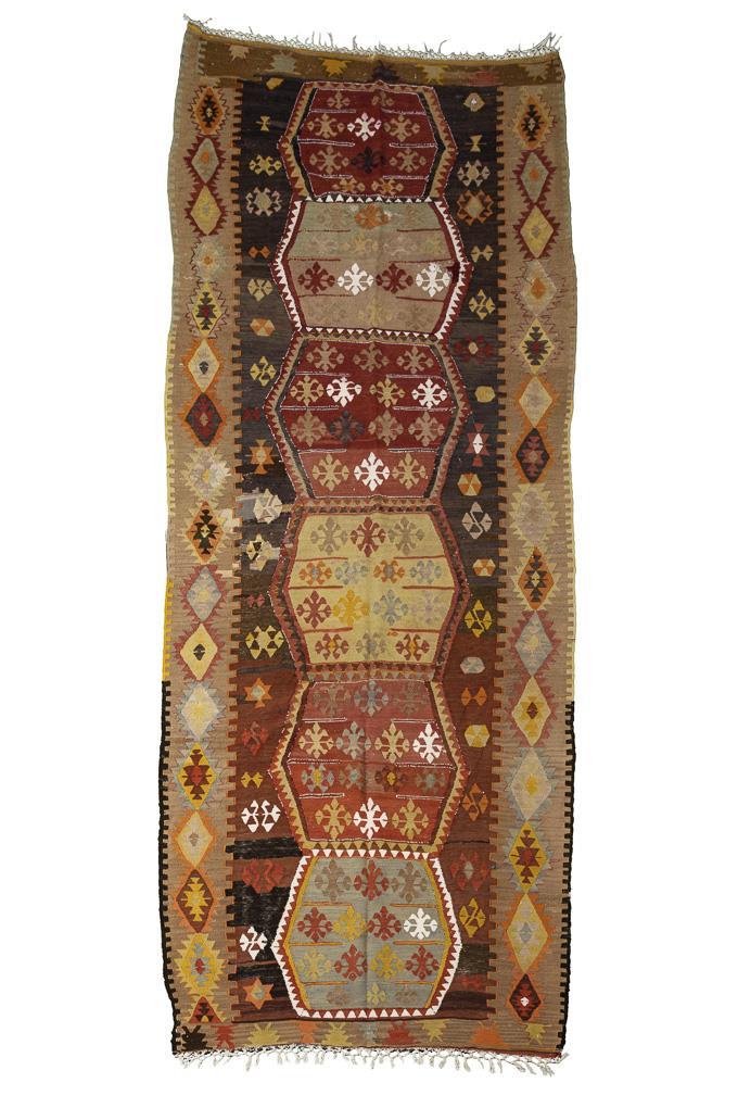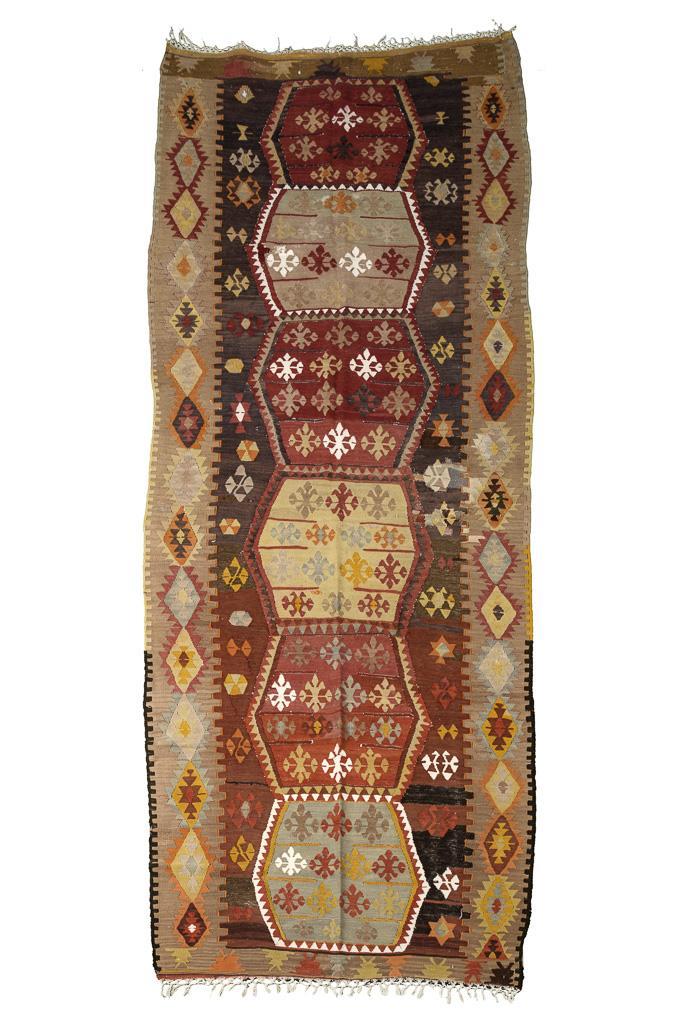 Wolle, Flachgewebe in Schlitzkelimtechnik mit verknoteten Kett-Enden. Polychromdekor mit Abrasch. 315 x 121 cm.