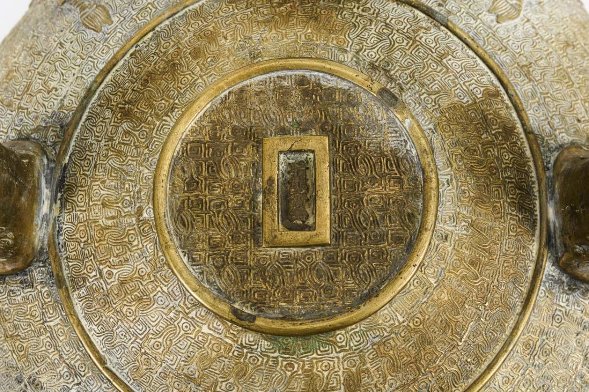 Dreibeiniges Gefäß mit feiner, flächendeckender Reliefmusterung sowie Elefantenköpfen, Qilin und Schildkröte mit bemoostem Schwanz im Halbrelief. Bewegliche Handhaben.