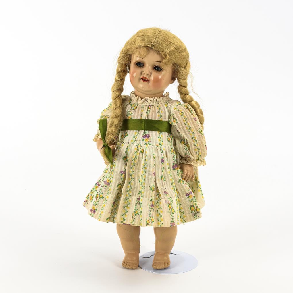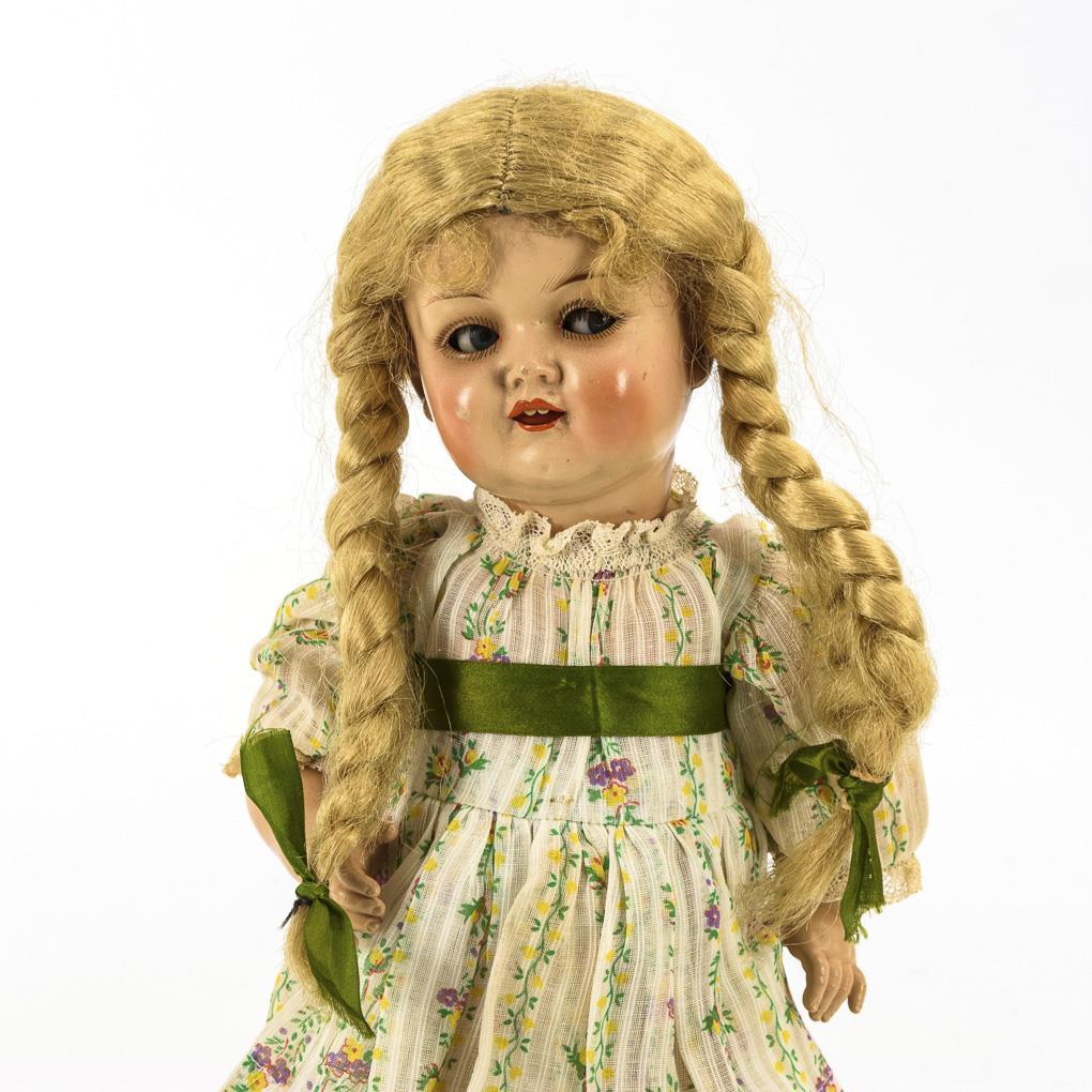 Kurbelkopf, blaue Schlaf-/Schelmenaugen, blonde Kunsthaarperücke mit Zöpfen. 5-teiliger Stehpuppenkörper. Helles Kleid mit Blumenmuster.