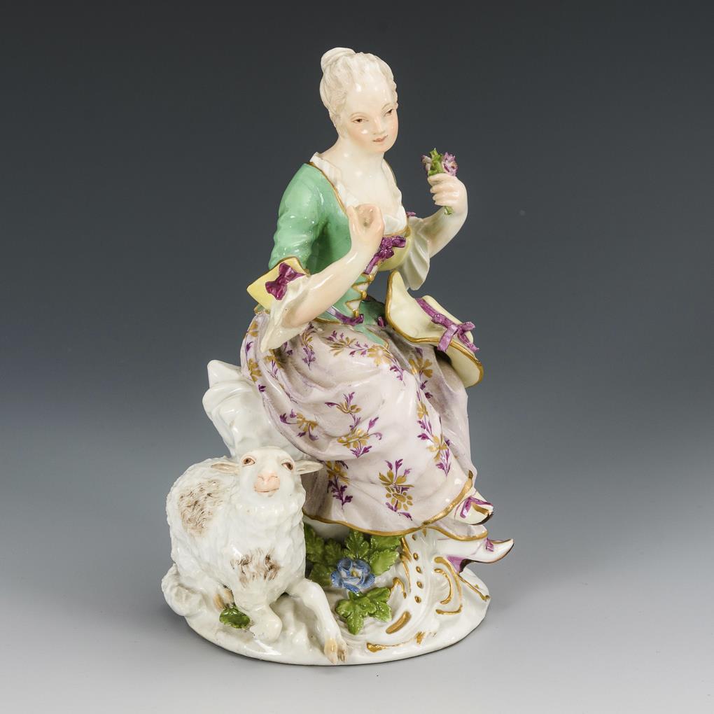 Auf einem Felssockel sitzende Schäferin mit Schaf bzw. Schäfer mit Hund. Restauriert, 1 Schafbein fehlt, Blüten und Blätter bestoßen.