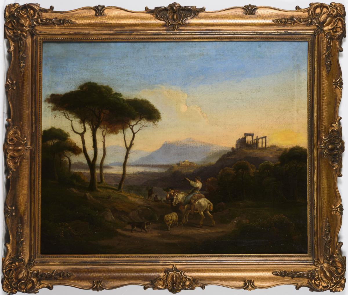 Ideallandschaft mit Hirtenpaar nahe antiker Ruinen im warmen Sonnenschein. Eine kleine restaurierte Stelle mit Hinterklebung.