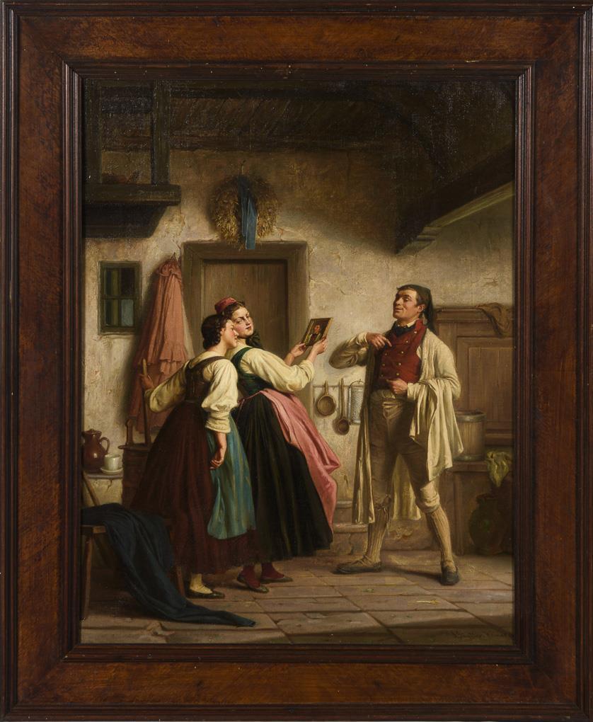 Bauernstube mit stolzem jungem Mann, dessen Bildnis von zwei jungen Frauen kritisch betrachtet wird. Restauriert mit Hinterklebungen.