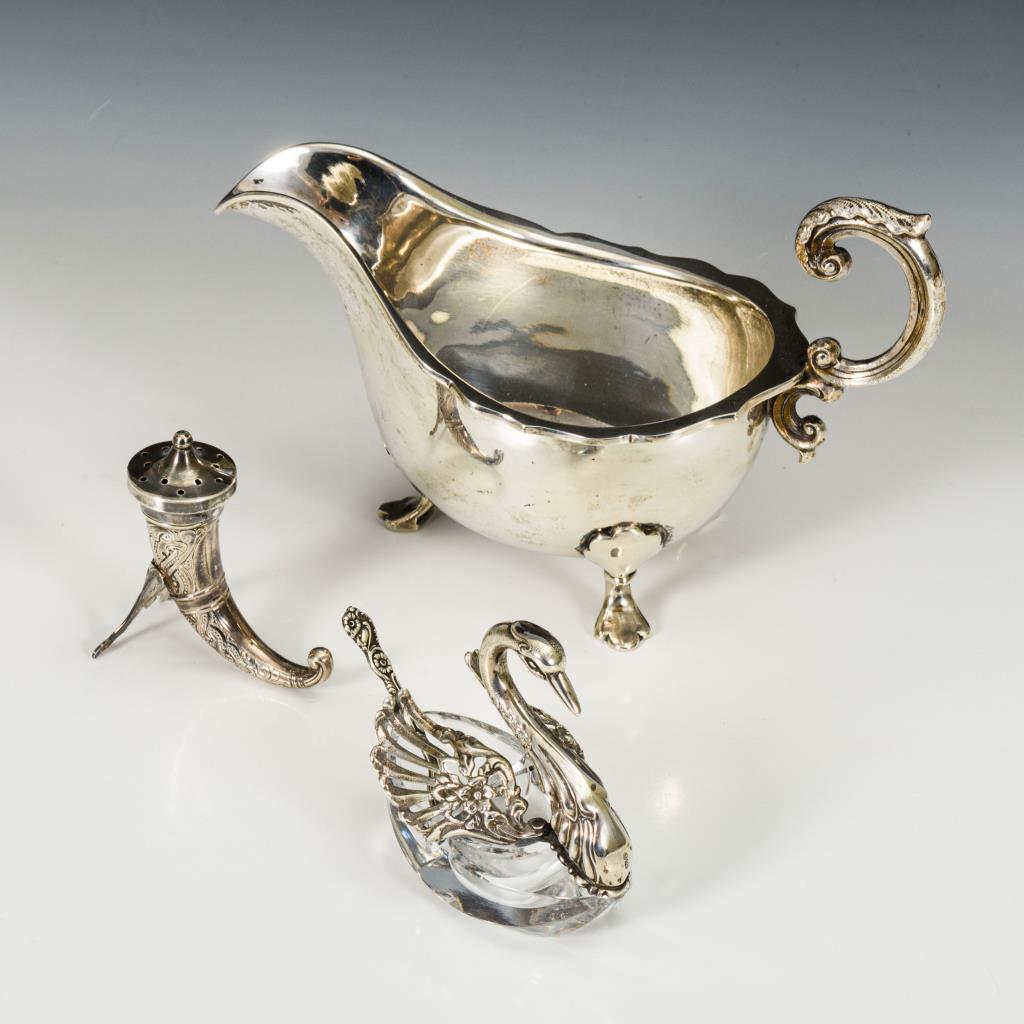 Sauciere, Gewürz-Schwan und Salzstreuer als Füllhorn. Dazu 1 Alpacca-Löffelchen.