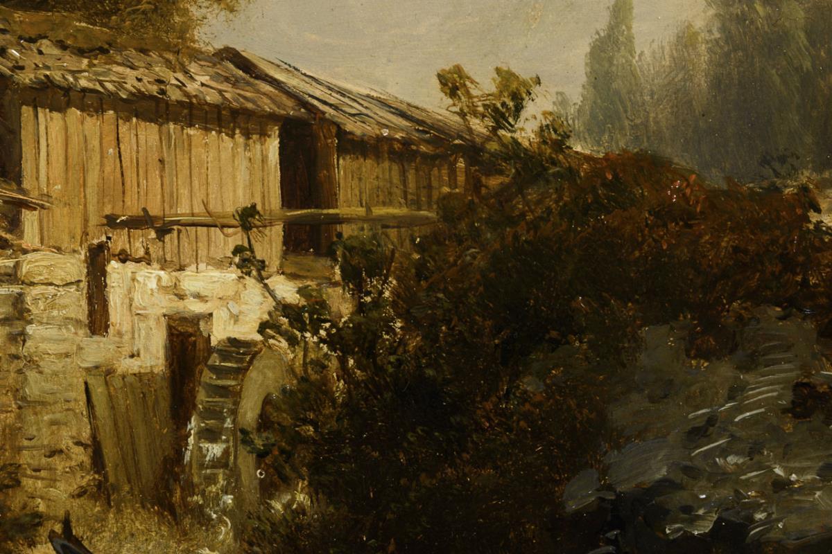 Sägewerk mit großem Mühlrad am reißenden Gebirgsfluss mit Blick zum Gipfel am Horizont.