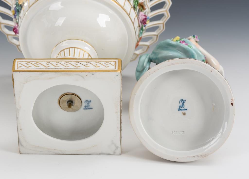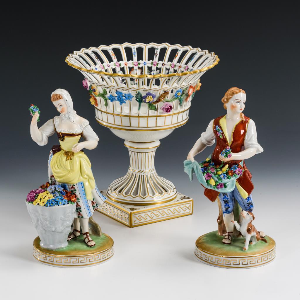 Gärtnerin an Blumenkorb (H 20,5 cm), Gärtner mit blütengefüllter Schürze (H 21,5 cm) und Durchbruchkorb mit Blütenbelag (H 21,5 cm).