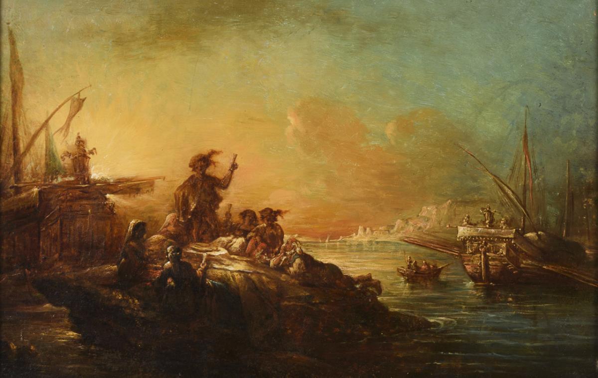 Kleines Gelage am felsigen Strand bei den Schiffen in der Abendsonne. Leichte Altersspuren.