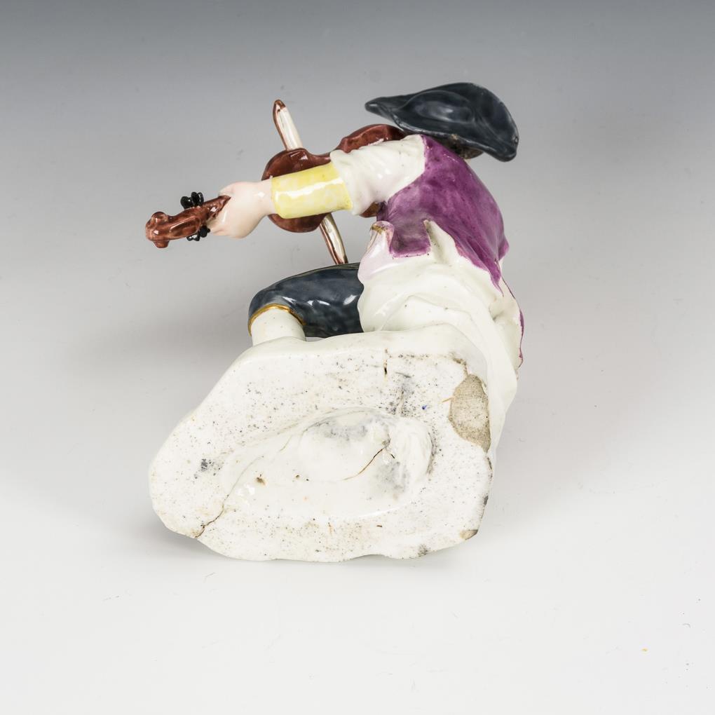 Auf einem Steinsockel sitzender, eine Violine spielender junger Mann. Chip am Stand, Violine, Bogen und beide Arme restauriert.