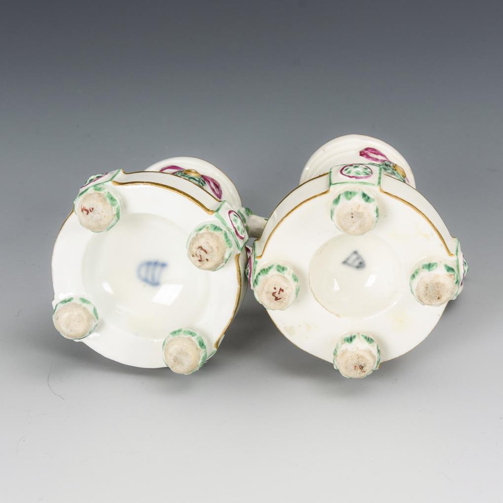 In Form eines Säulenstumpfes gestaltete Leuchter mit Henkel, schleifenbekrönten Lorbeergirlanden und beidseitig einem erhabenen Ovalmedaillon mit Blumenmalerei. 1x Restaurierung an der Säulenbasis, 1x Henkel und unterseitig restauriert.