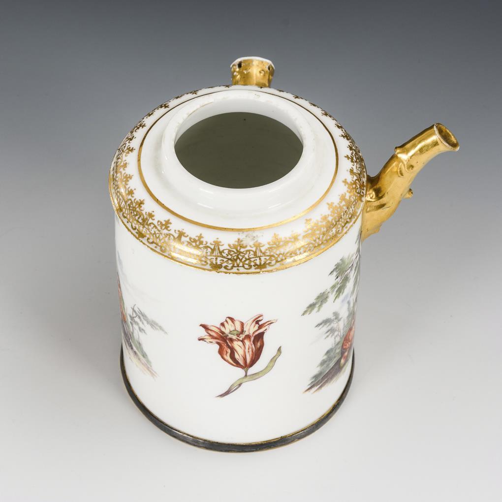 Zylinderkanne mit Röhrenausguss und seitlichem Stielansatz. Schauseitig die Darstellung zweier Rokokodamen vor einem Fruchtarrangement, verso eine Rokokodame mit einem Knaben in einer Parklandschaft. Ohne Deckel und Stiel, minimaler Goldabrieb.