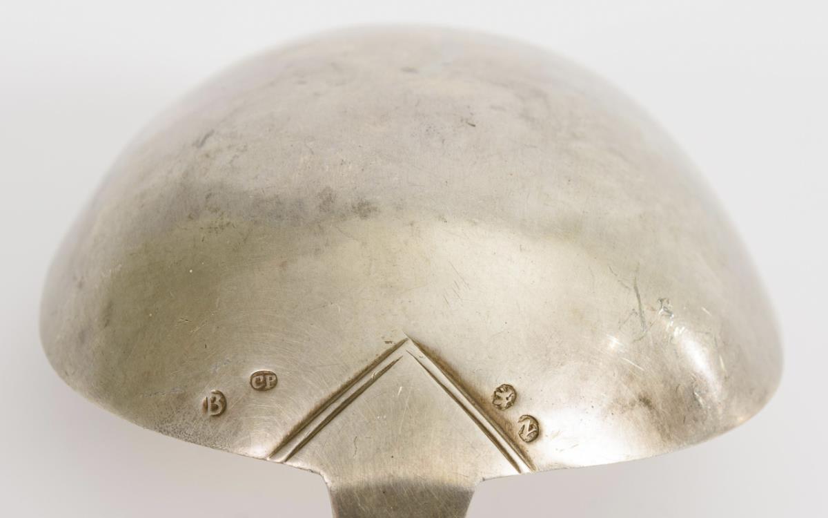 Sehr großer Löffel mit tiefer, vergoldeter Laffe und spitzem Griffende. Gebrauchsspuren.